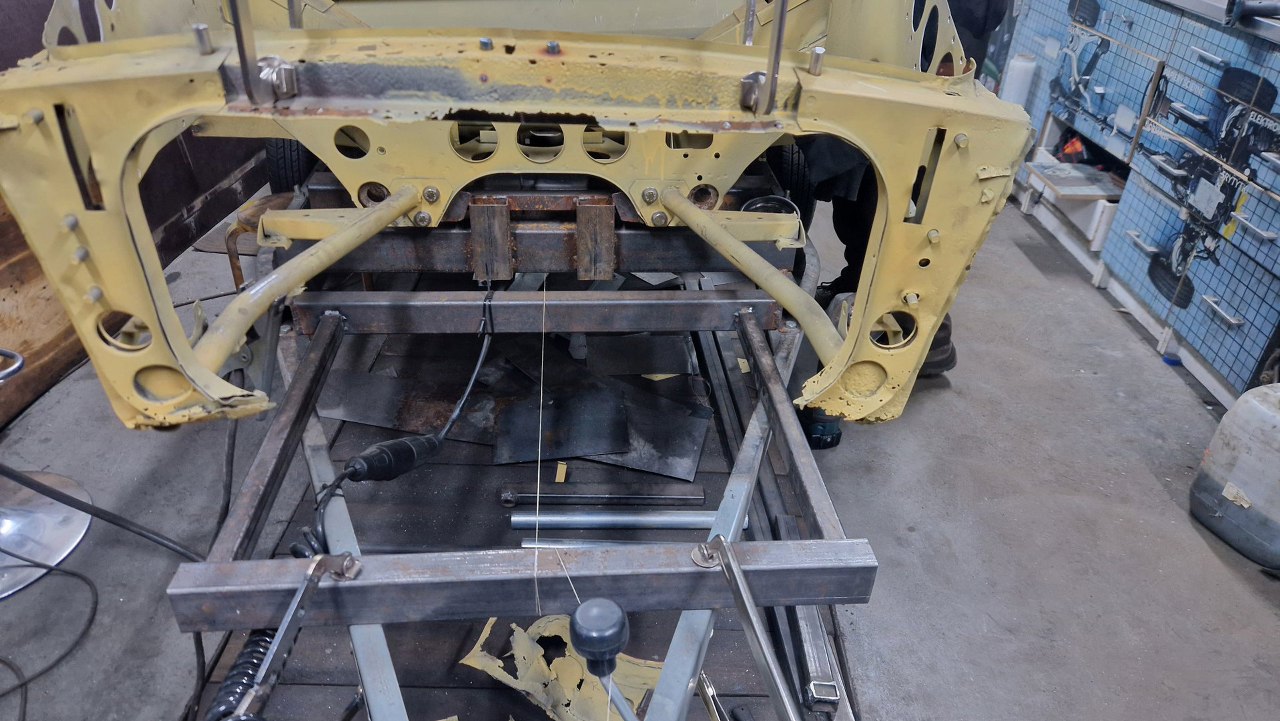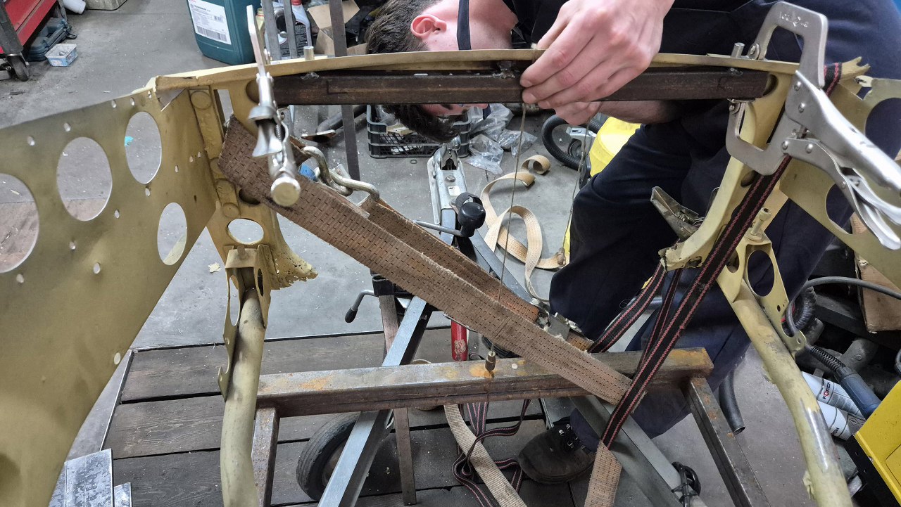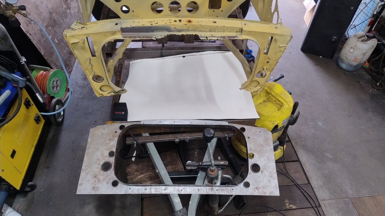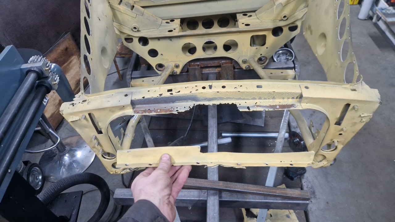 W tym momencie wspawaliśmy dwie rury, pozostałe ze wzmocnień słupków A, jako podparcie dla górnego profilu. Inny profil, przyspawany po skosie, ustala to w pionie.