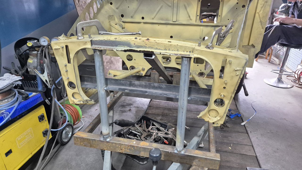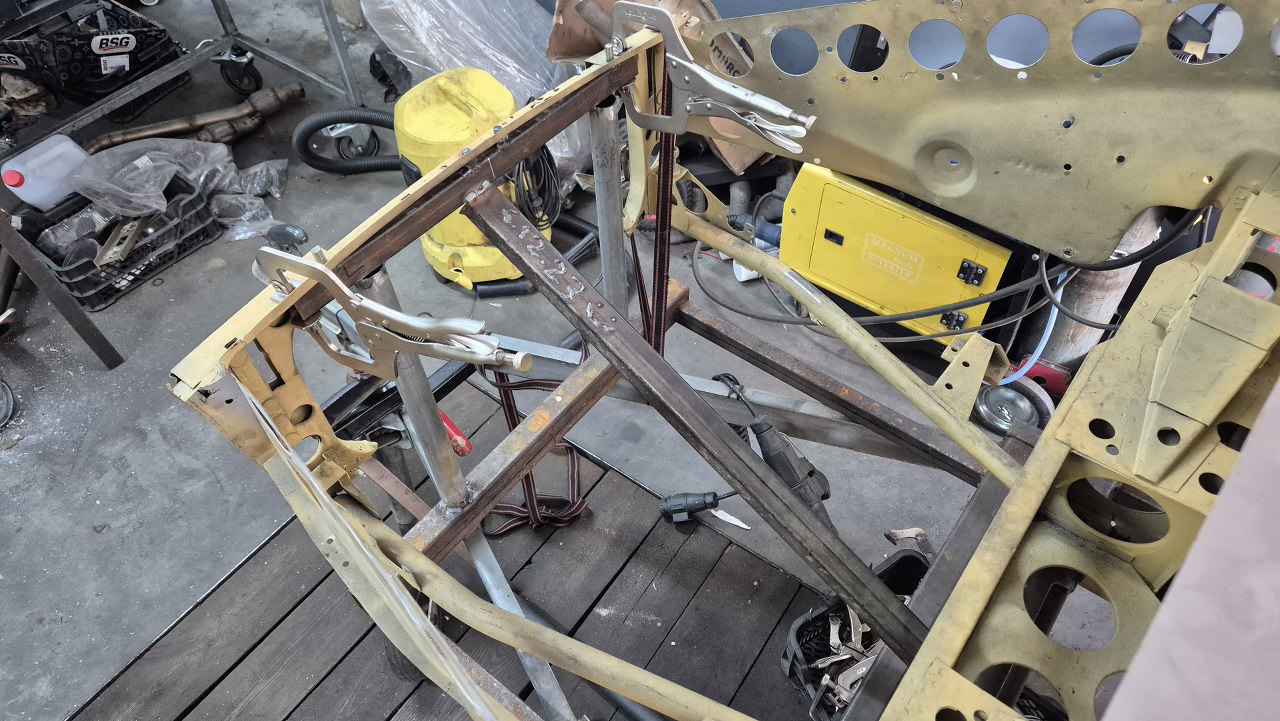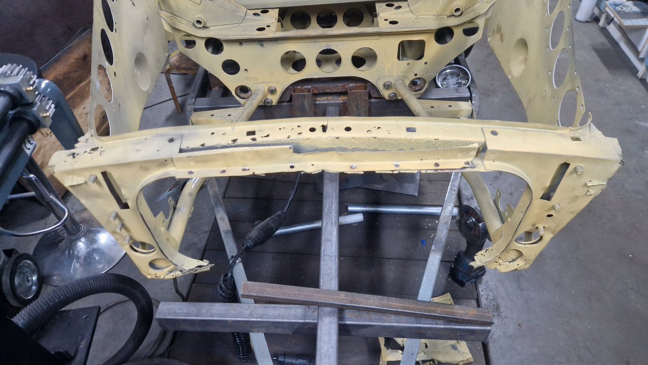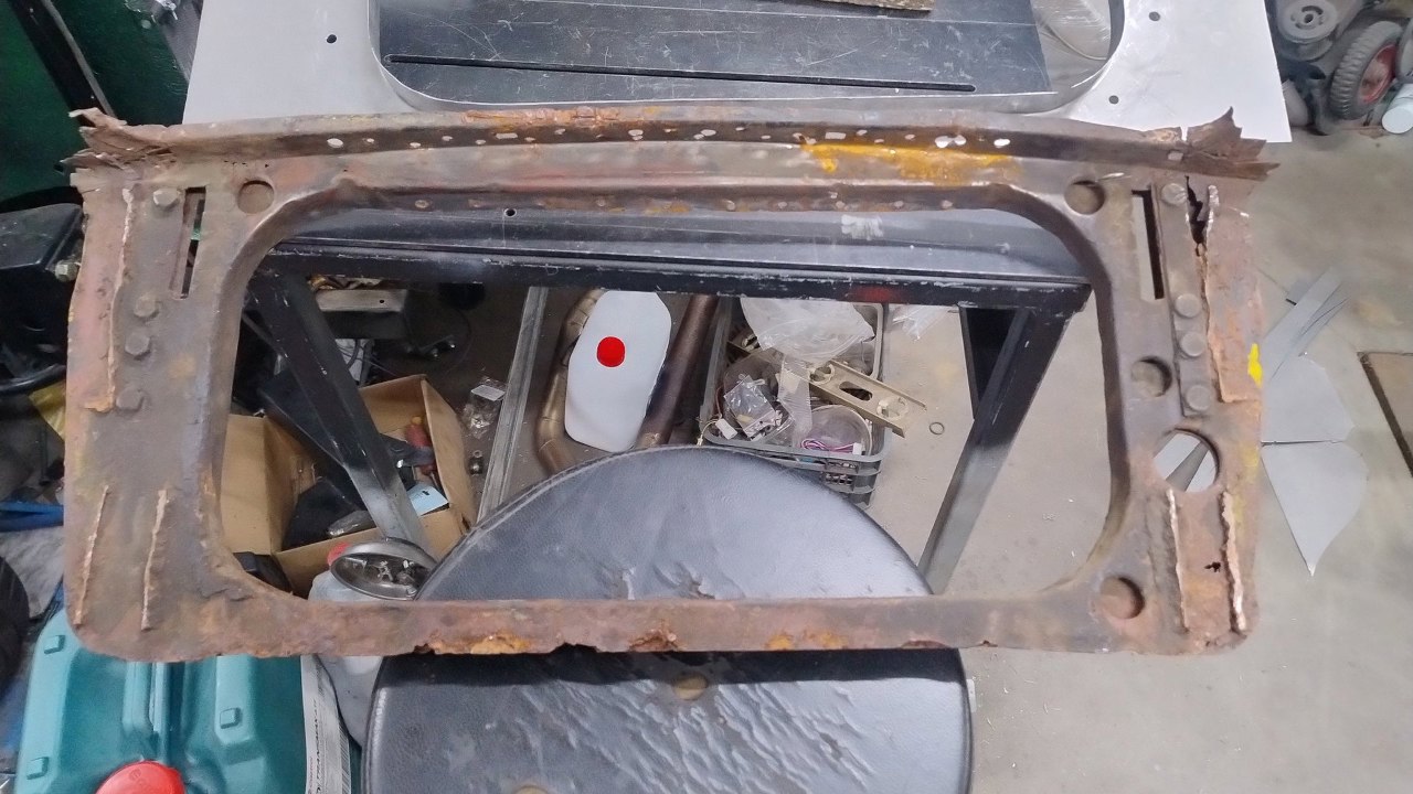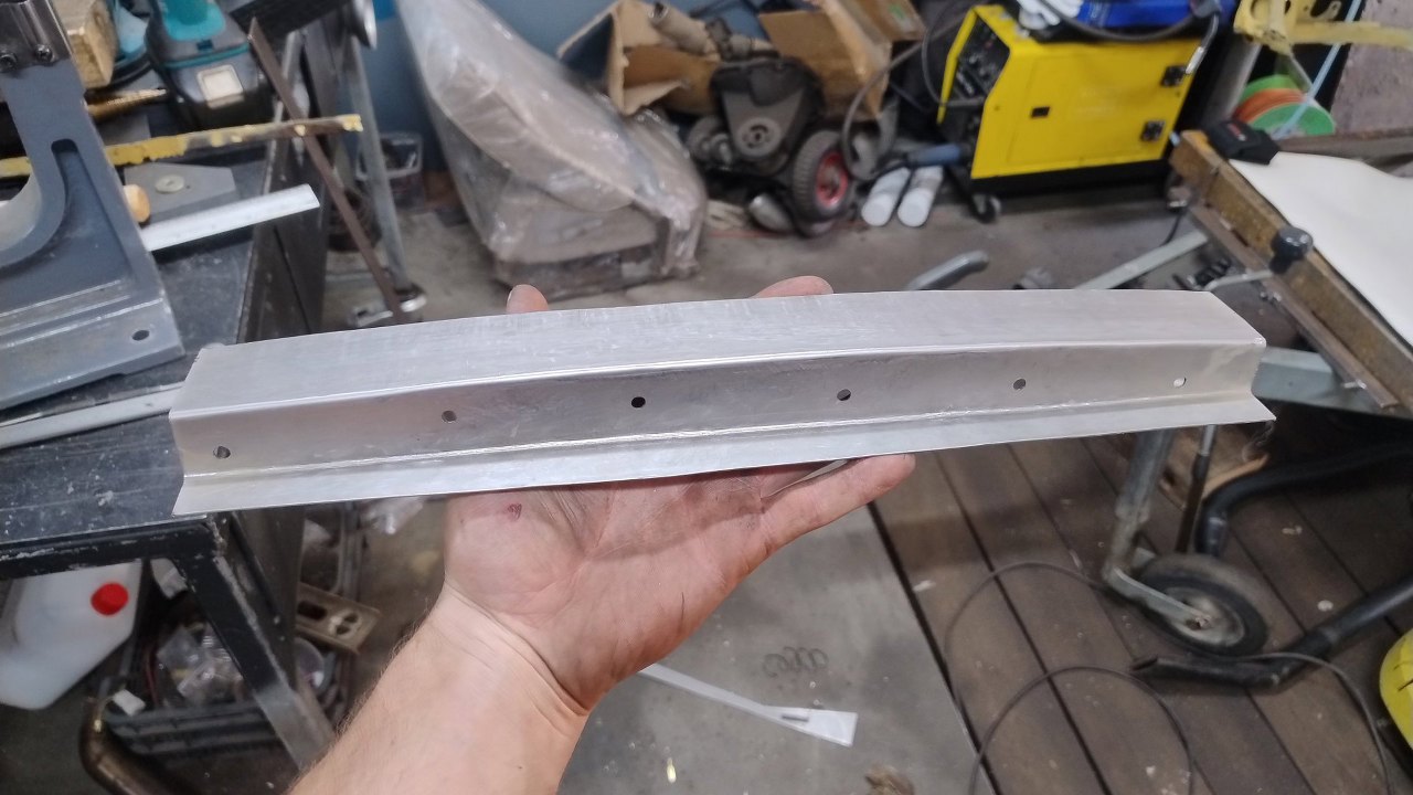 W tym momencie wspawaliśmy dwie rury, pozostałe ze wzmocnień słupków A, jako podparcie dla górnego profilu. Inny profil, przyspawany po skosie, ustala to w pionie.