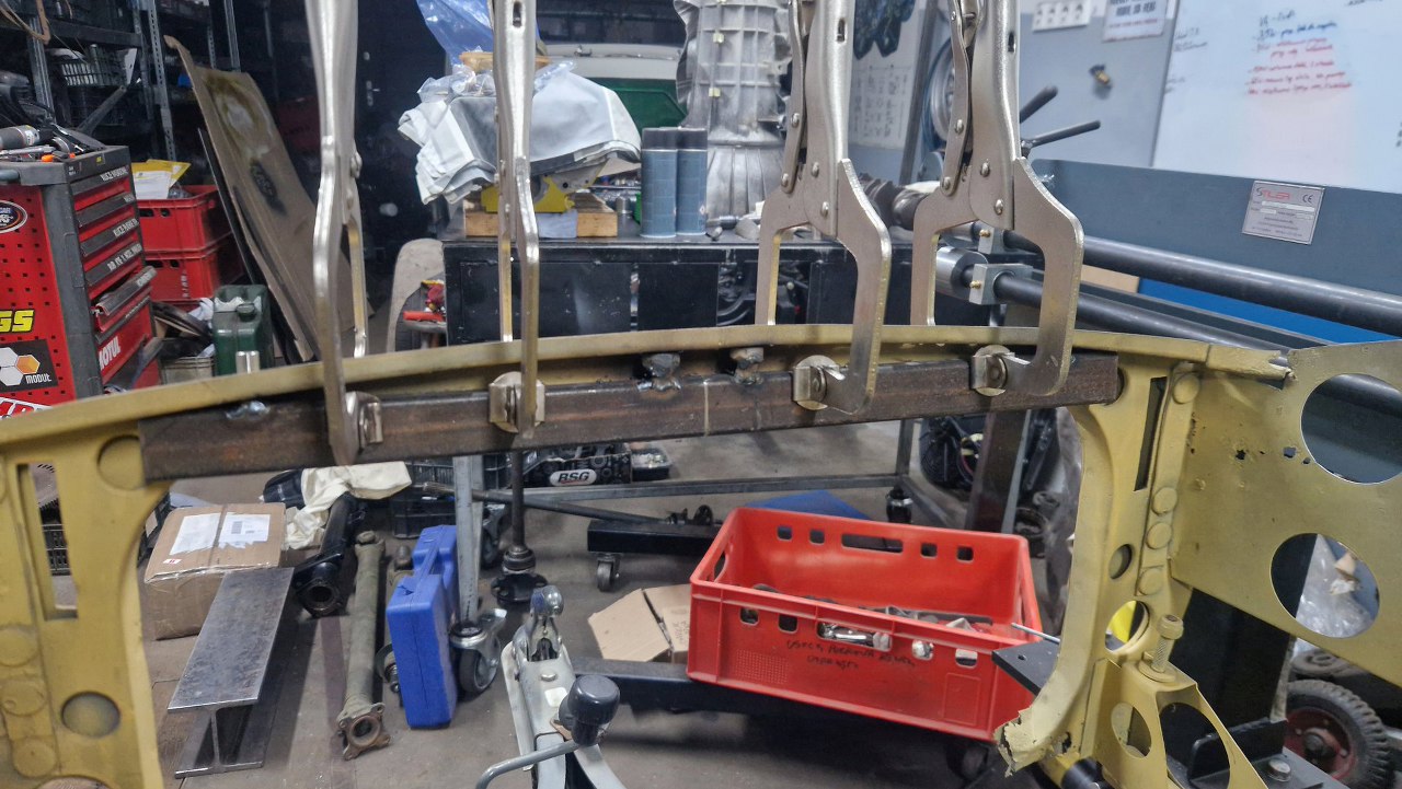 W ten sposób ustawiony profil ma zaznaczony środek. Do ramy podwoziowej dospawaliśmy dodatkowy kawałek ramy, który pozwoli nam na ustawienie przodu. Wyznaczyliśmy i tu środek, w profilu nacięty nieco szlifierką, żeby widoczny na zdjęciu sznurek trafiał w ten rowek. W głównej części ramy, przypominam, również są wycięte takie rowki, żeby łatwo było się odnieść do osi samochodu.