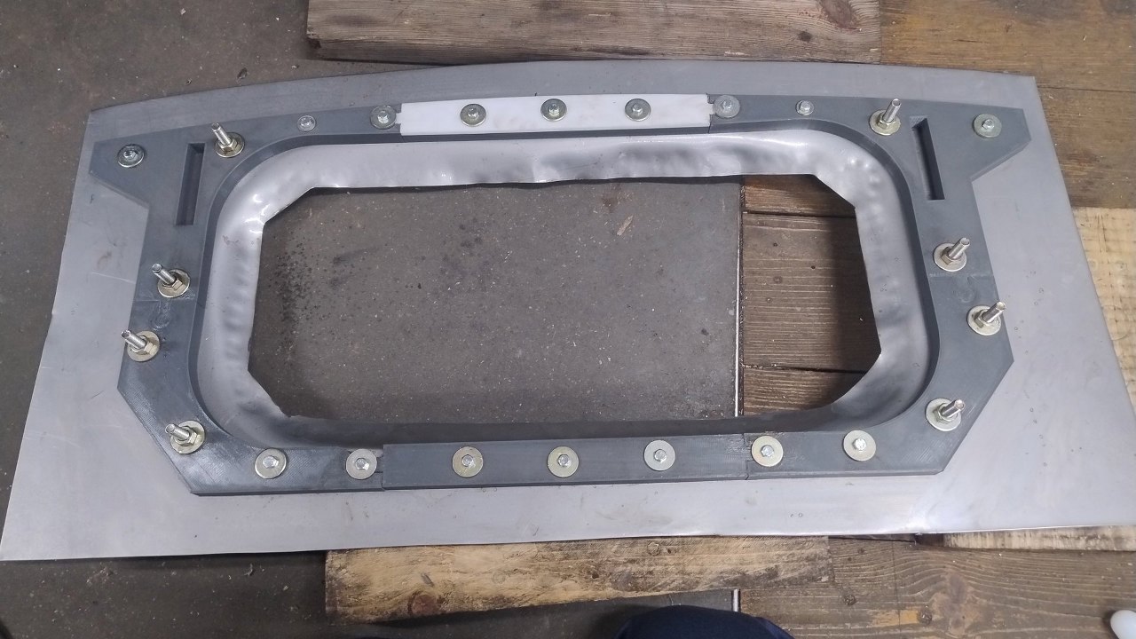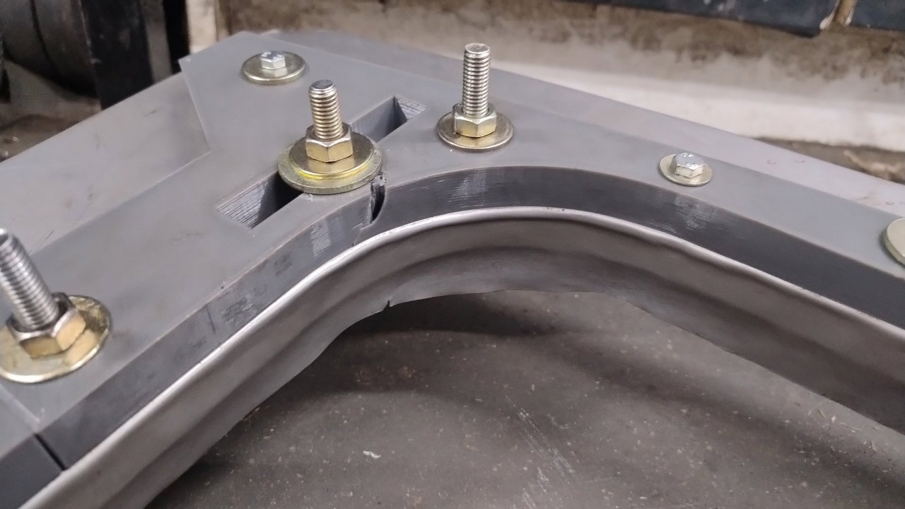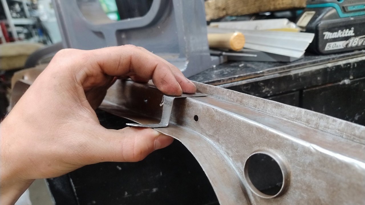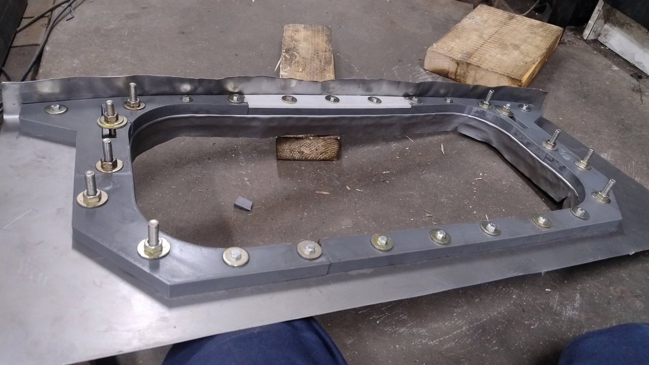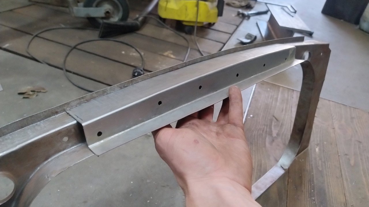 W ten sposób wykonane zostały otworki (śruby skręcające formę przez nie przechodziły, żeby ograniczyć ilość niepotrzebnego wiercenia, teraz zostały rozwiercone) i ich przetłoczenia. W górnej, zakrzywionej części Maciek wygiął jeszcze rant według oryginału. Małe otworki po śrubkach są niepotrzebne i będą zaspawane.