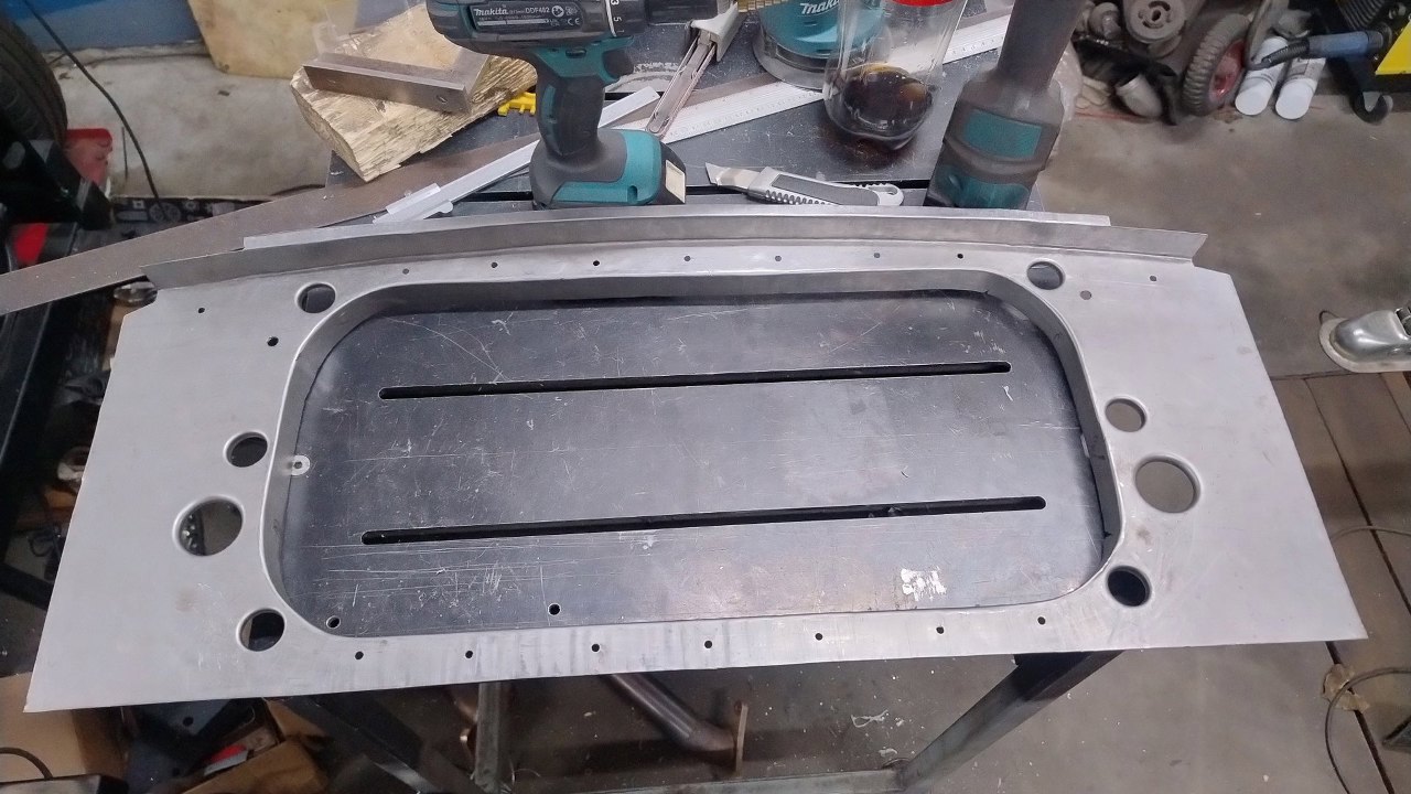 Drobna rzecz na początek, to odwiercenie górnej blaszki, żeby był łatwiejszy dostęp do glownej części. Cały ten przód to główna część od strony bagażnika, a na nią idą cztery mniejsze na wierzch - boki, dół i góra.