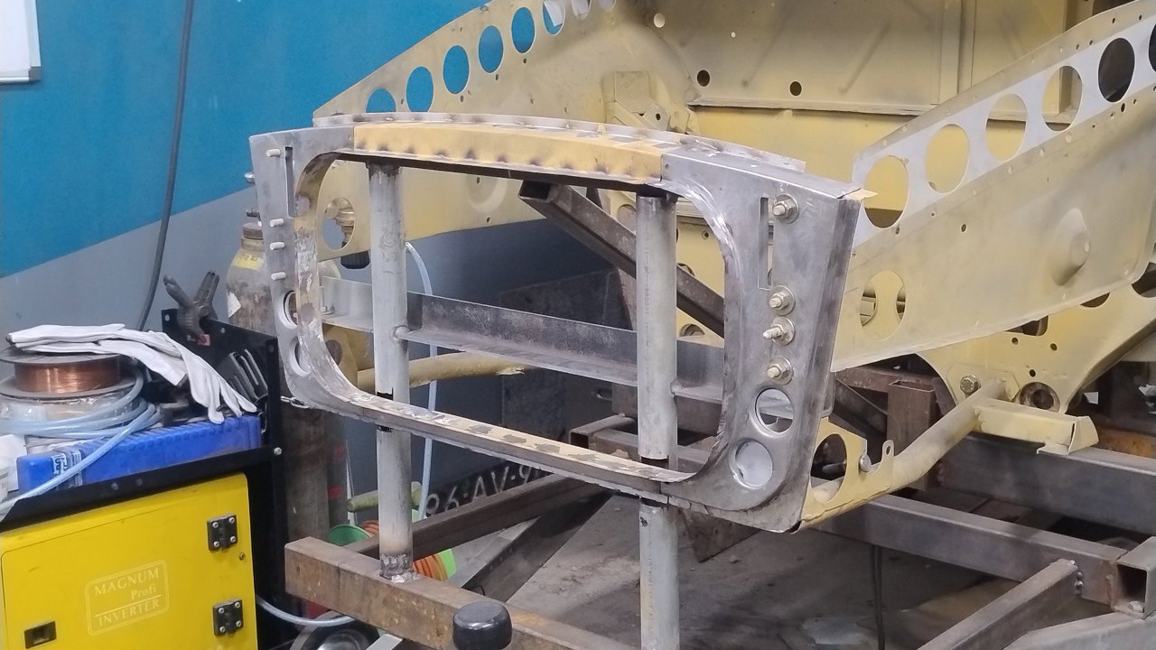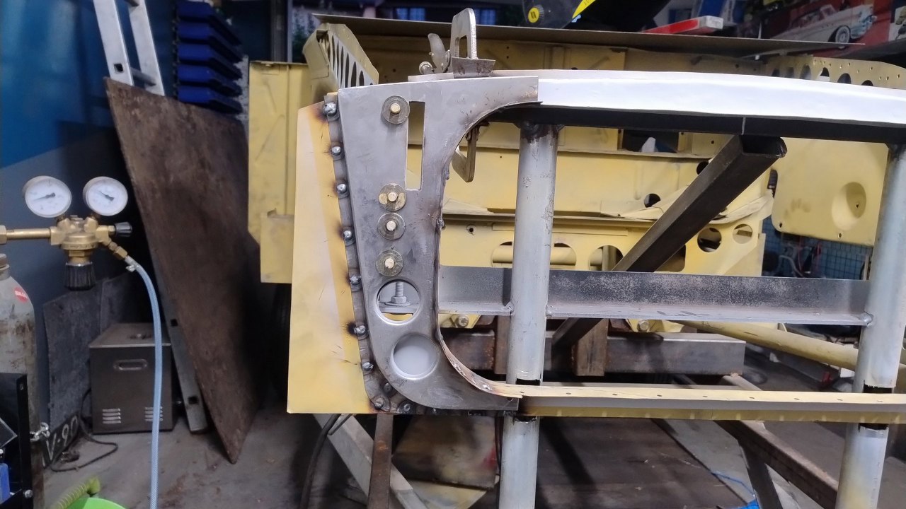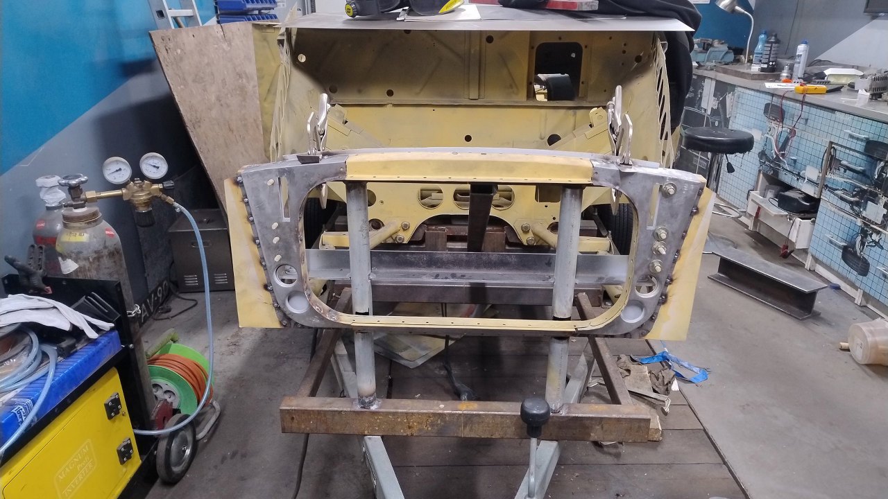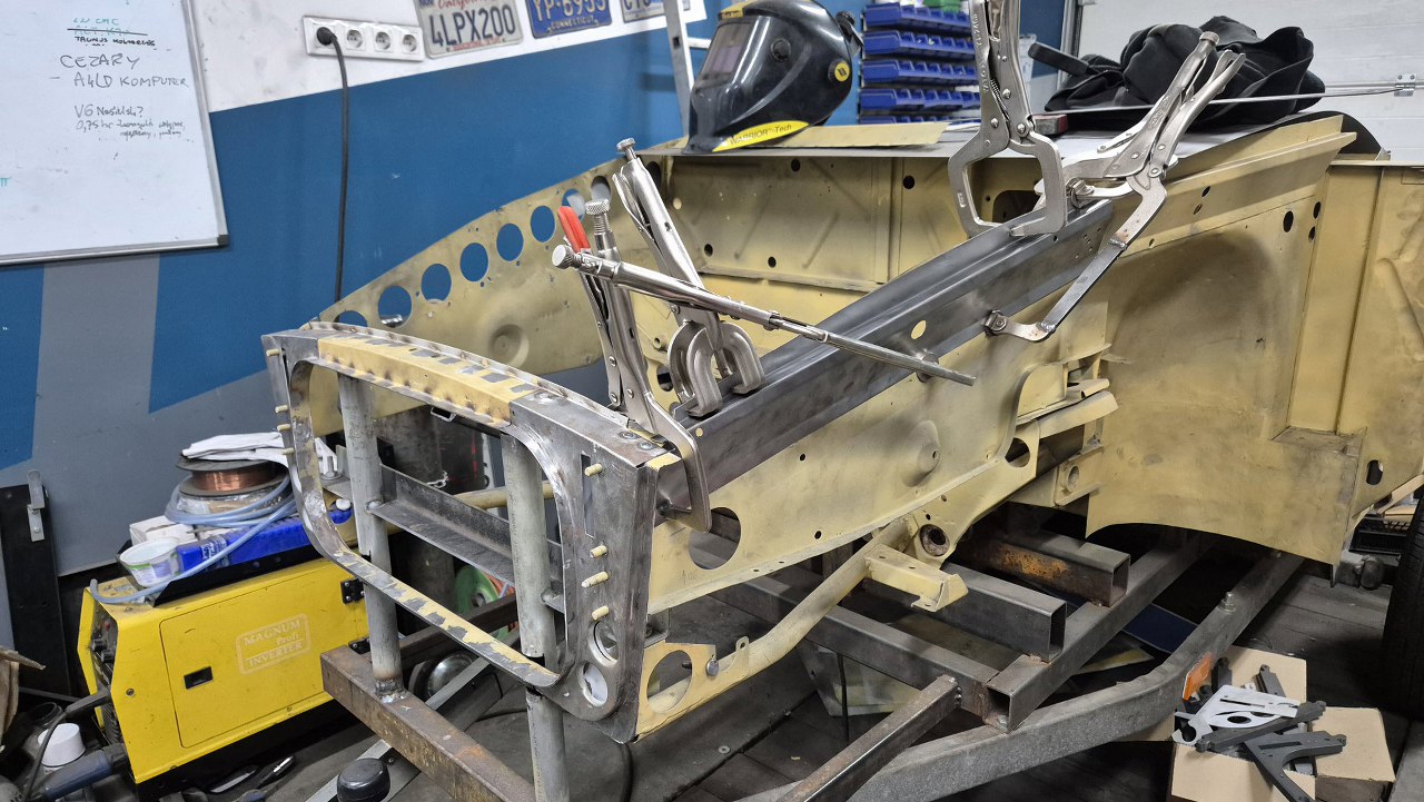 Po wyschnięciu podkładów Maciek zaczyna składać resztę przodu. Blachy boczne tu są na początku nakładania na śruby. Wszędzie są już zrobione otworki na spawy.