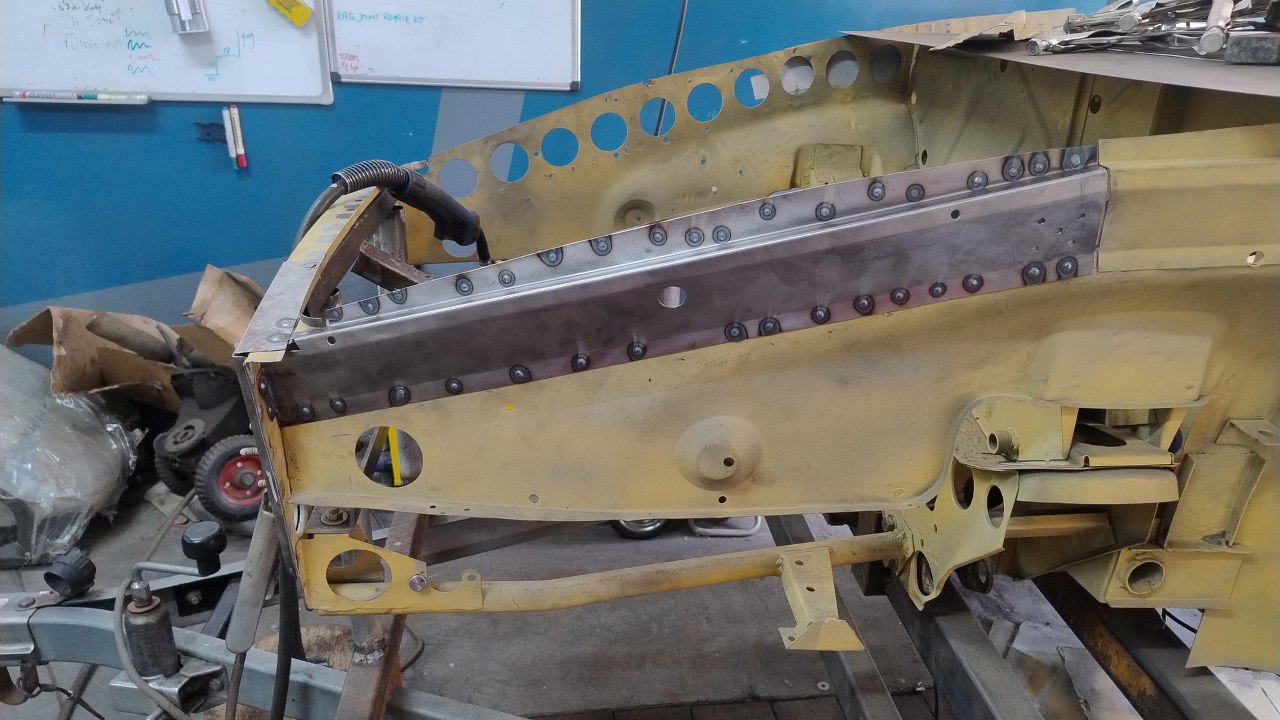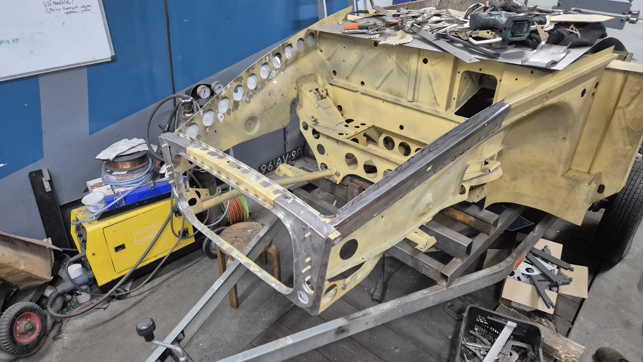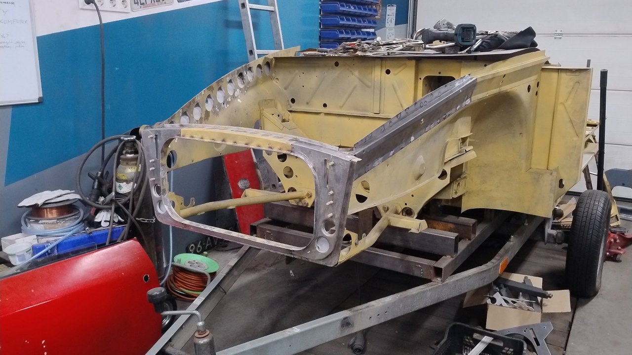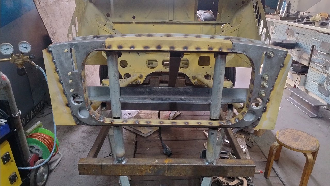 Po wyschnięciu podkładów Maciek zaczyna składać resztę przodu. Blachy boczne tu są na początku nakładania na śruby. Wszędzie są już zrobione otworki na spawy.