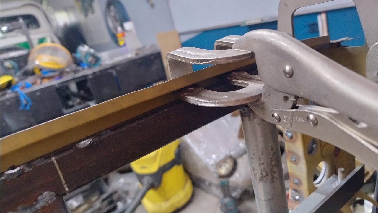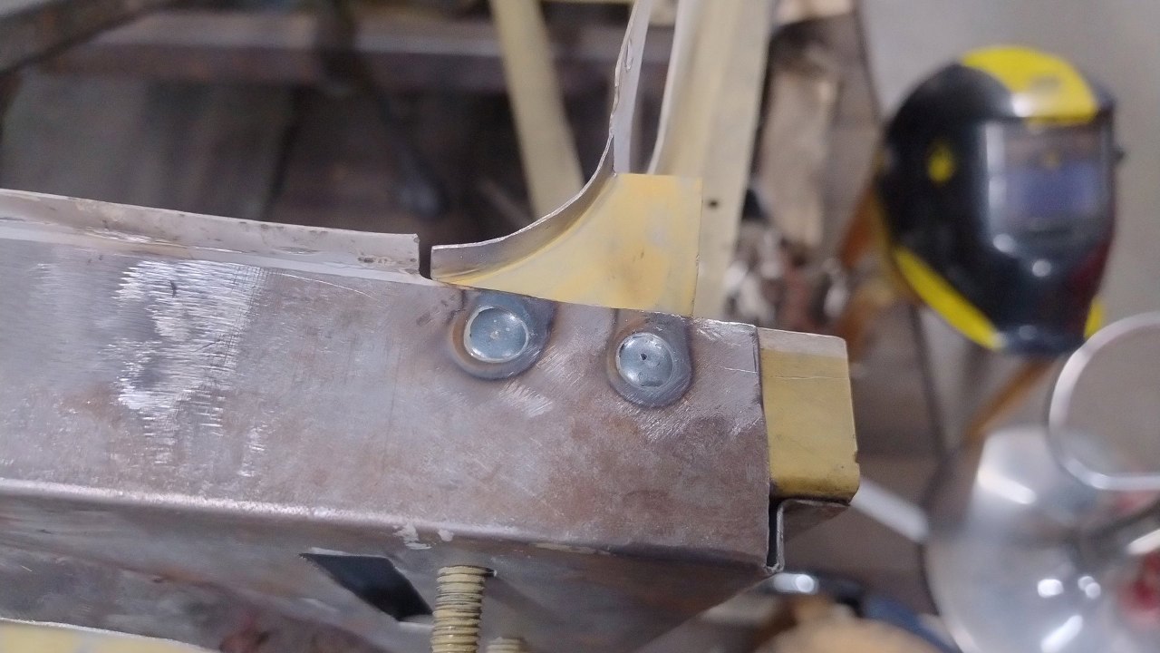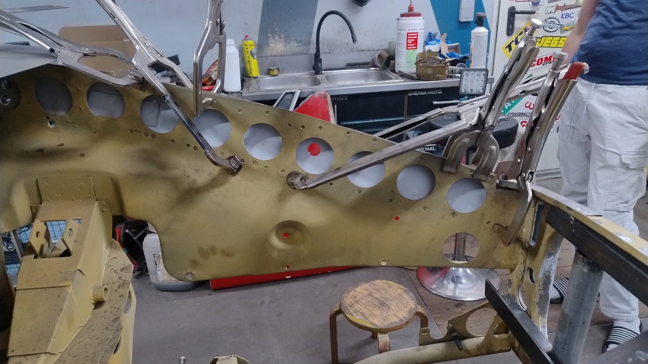 Tu też nowe wzmocnienie zostało złapane ściskami. Przymierzanie tego nie jest proste, bo mamy odmierzone w jakie miejsce to powinno trafić. W końcu na to przykręcane będą błotniki zewnętrzne.
