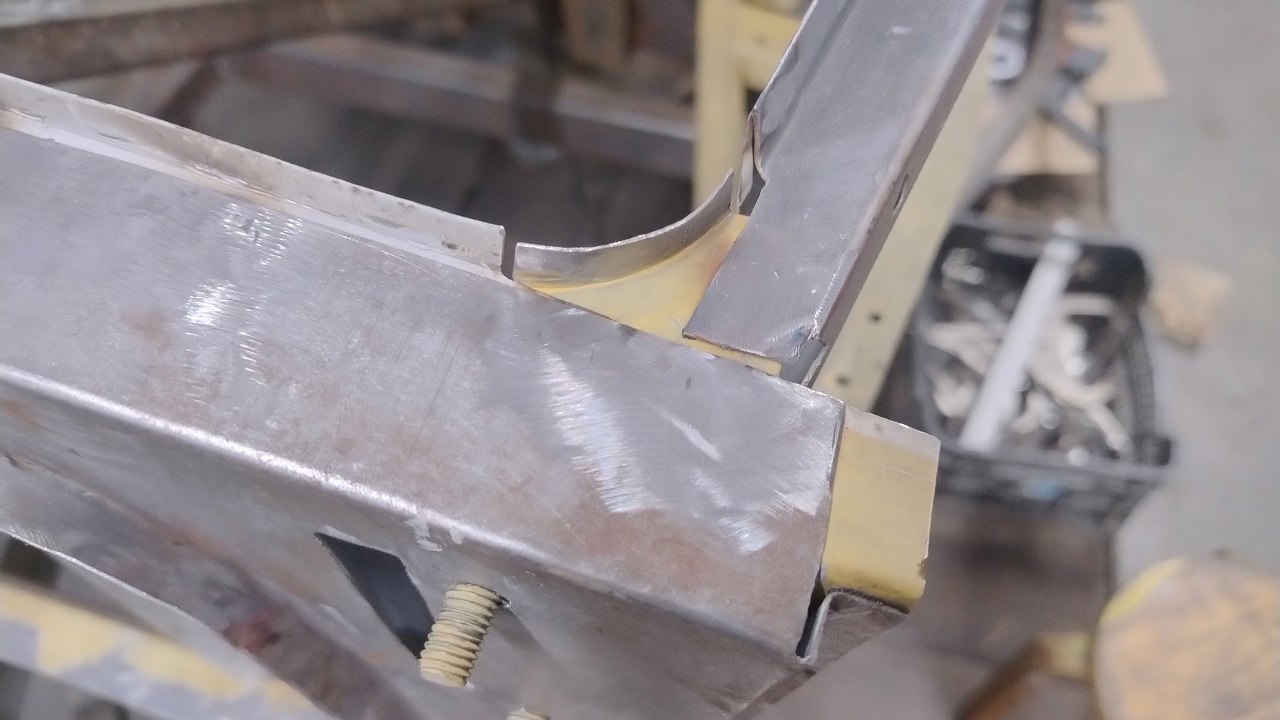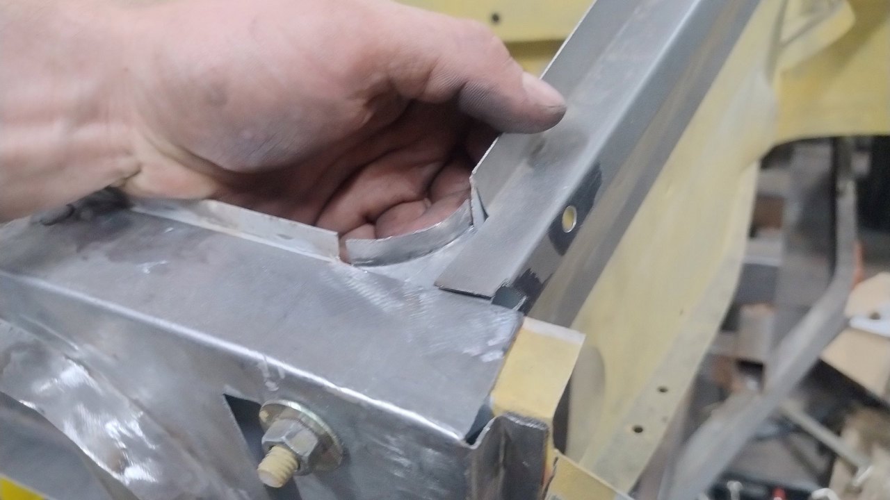 Z przodu wzmocnienie zagina się pod kątem prostym i wspawane jest do przedniej blachy.