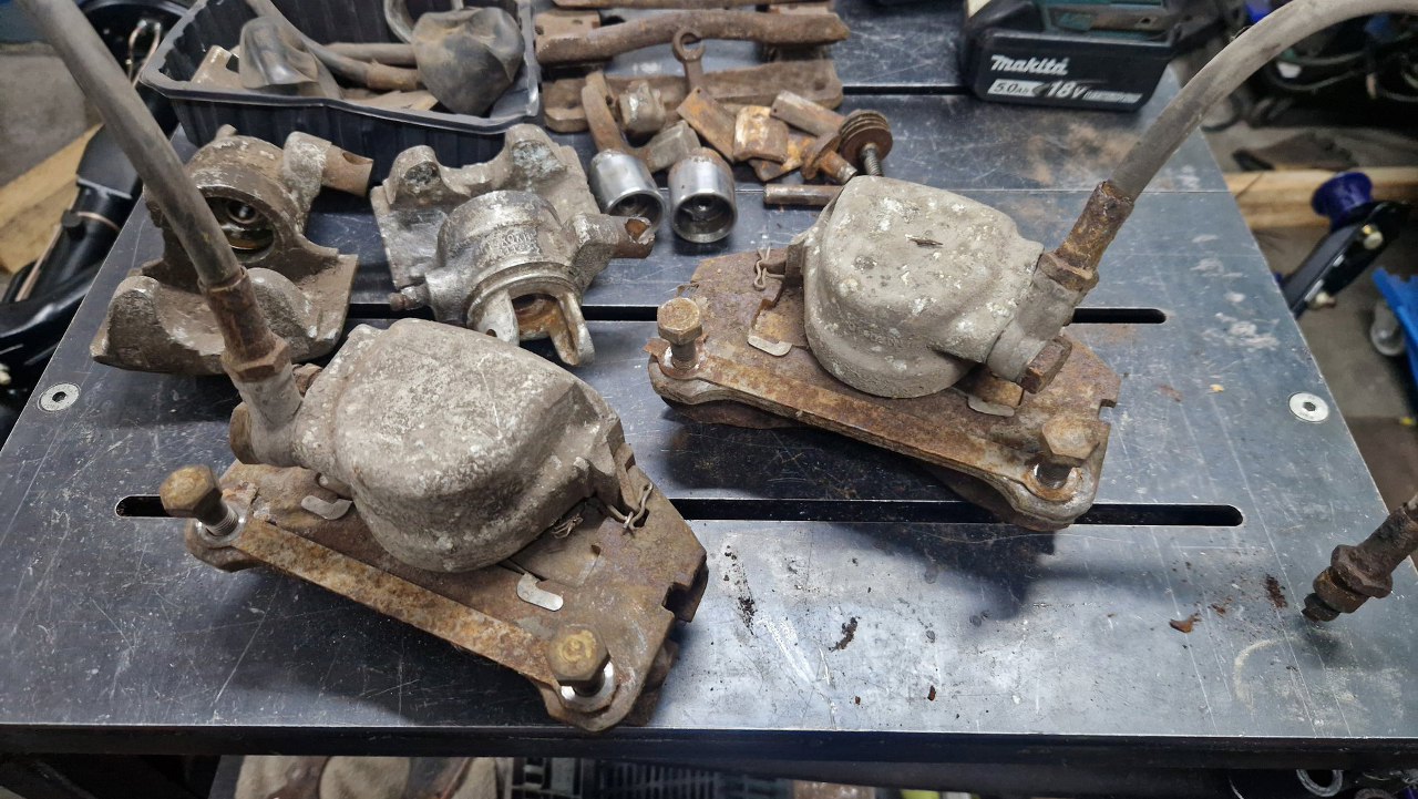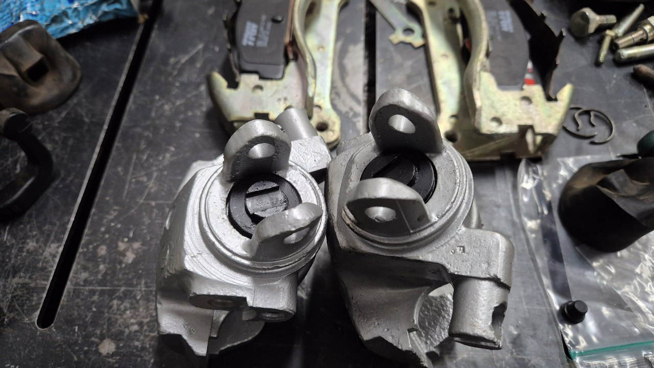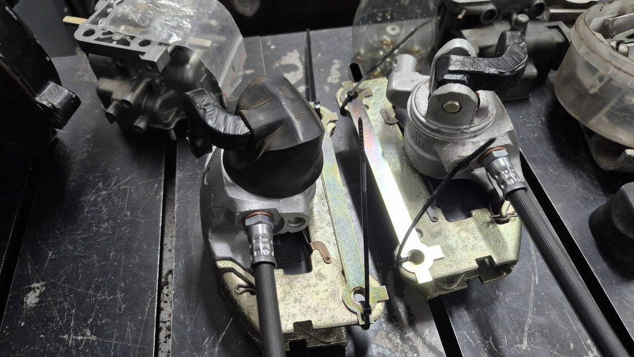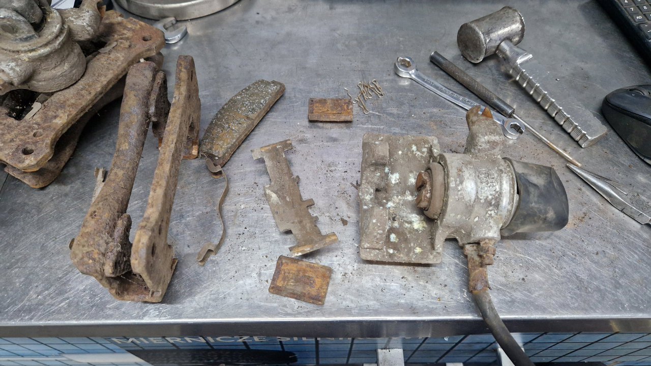 Zaczynam od retrospekcji, żeby pokazać jak wyglądały przed zrobieniem. Tu są tylne zaciski, z dźwigniami hamulca postojowego.