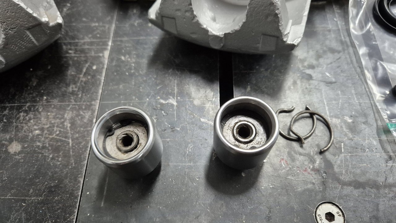 Po złożeniu wszystkiego do środka tłoczka chciałem użyć oryginalnych pierścieni sprężystych, ale nie chciały do końca się ułożyć w rowkach. Musiałem użyć dostarczonych w zestawie pierścieni Segera. Widocznie rowek w tłoczku jest ciut inny niż w oryginalnym. Teraz wszyscy nam będą wypominać brak oryginalności w hamulcach :).