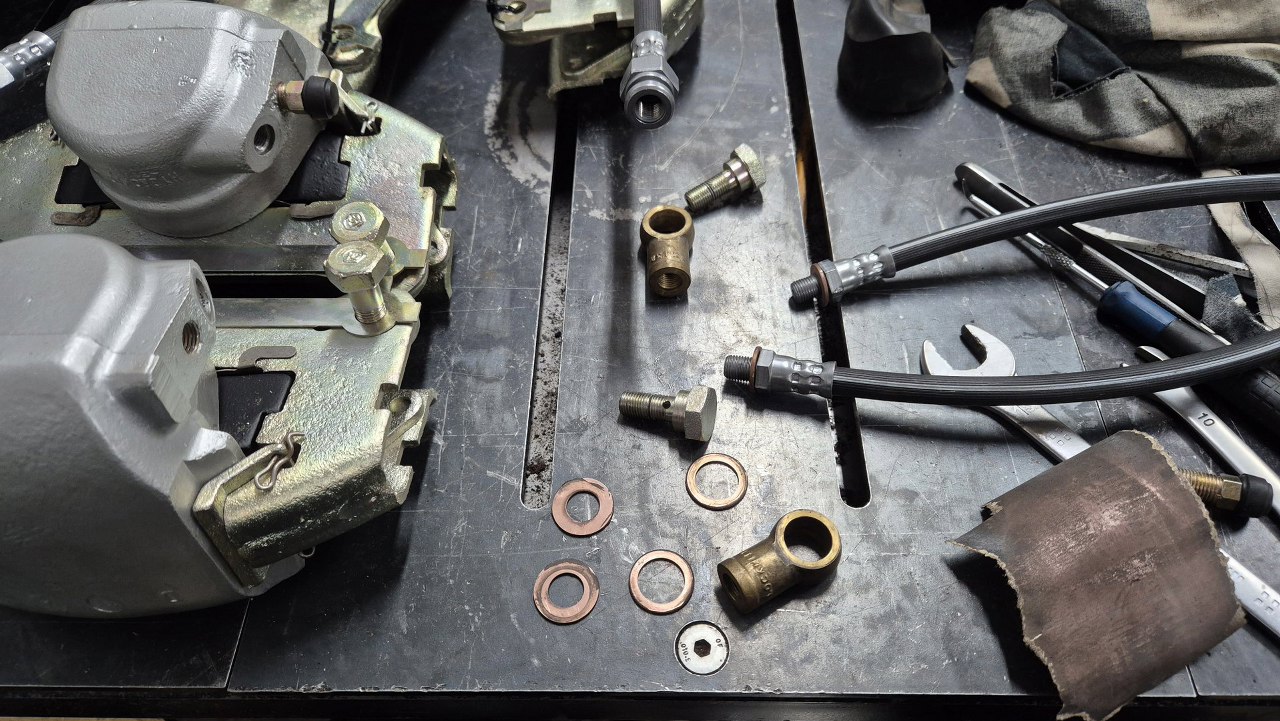 Przykręciłem też rurki hamulcowe. To też udało się kupić nowe. Rurki są krótkie, bo zaraz są przykręcone do sztywnych rurek idących wzdłuż wahaczy. Co ciekawe, odpowietrzniki (i rurki zapewne też, chociaż nie sprawdzałem) mają gwinty calowe.