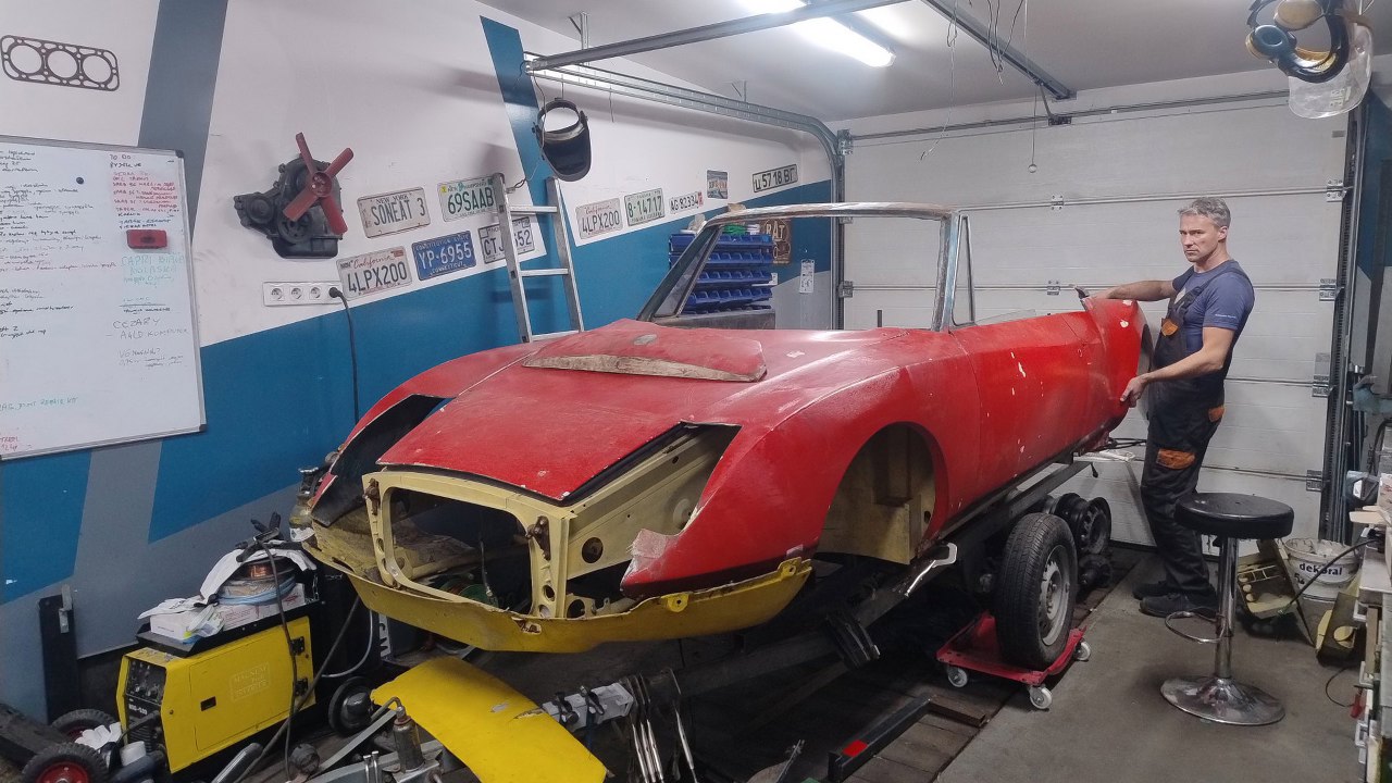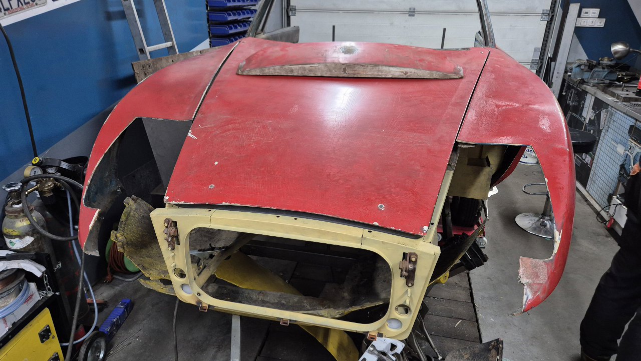 Błotniki nie mają jeszcze wszystkich otworów mocujących, ale łapiemy je aby tylko sie trzymały. Ustawiliśmy ramę szyby przedniej w miejscu arbitralnie uznanym przez nas za właściwe. Następnie przykręciliśmy i wyregulowaliśmy drzwi, a do nich błotniki.