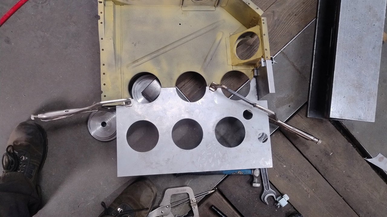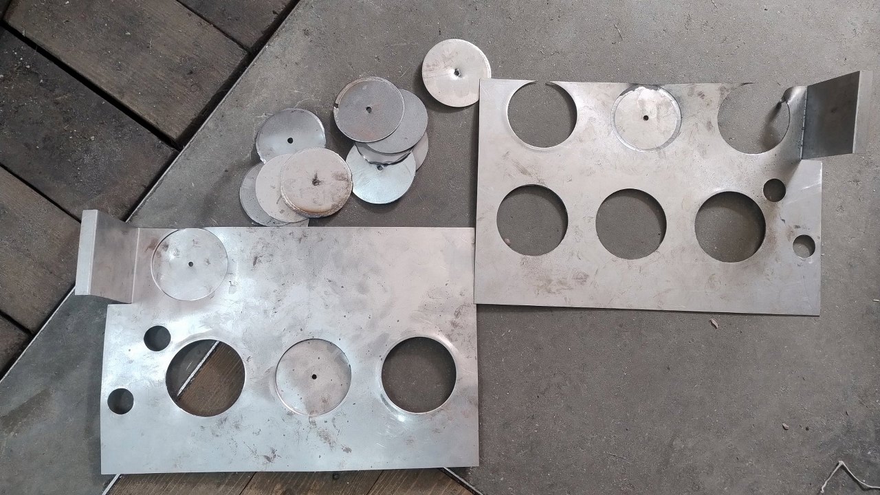 Próbowałem wycinać otwory nożem na wiertarce, ale nie miało to sensu - nóż się co chwila tępił, hałas był niemiłosierny, a w końcu gięła się blacha. Po chyba dwóch otworach miałem dosyć i wytoczyłem dwa krążki ze stali jako wykrojniki. W ten sposób wycięliśmy na prasie pozostałe otwory. Tylko te mniejsze były wywiercone i oszlifowane.