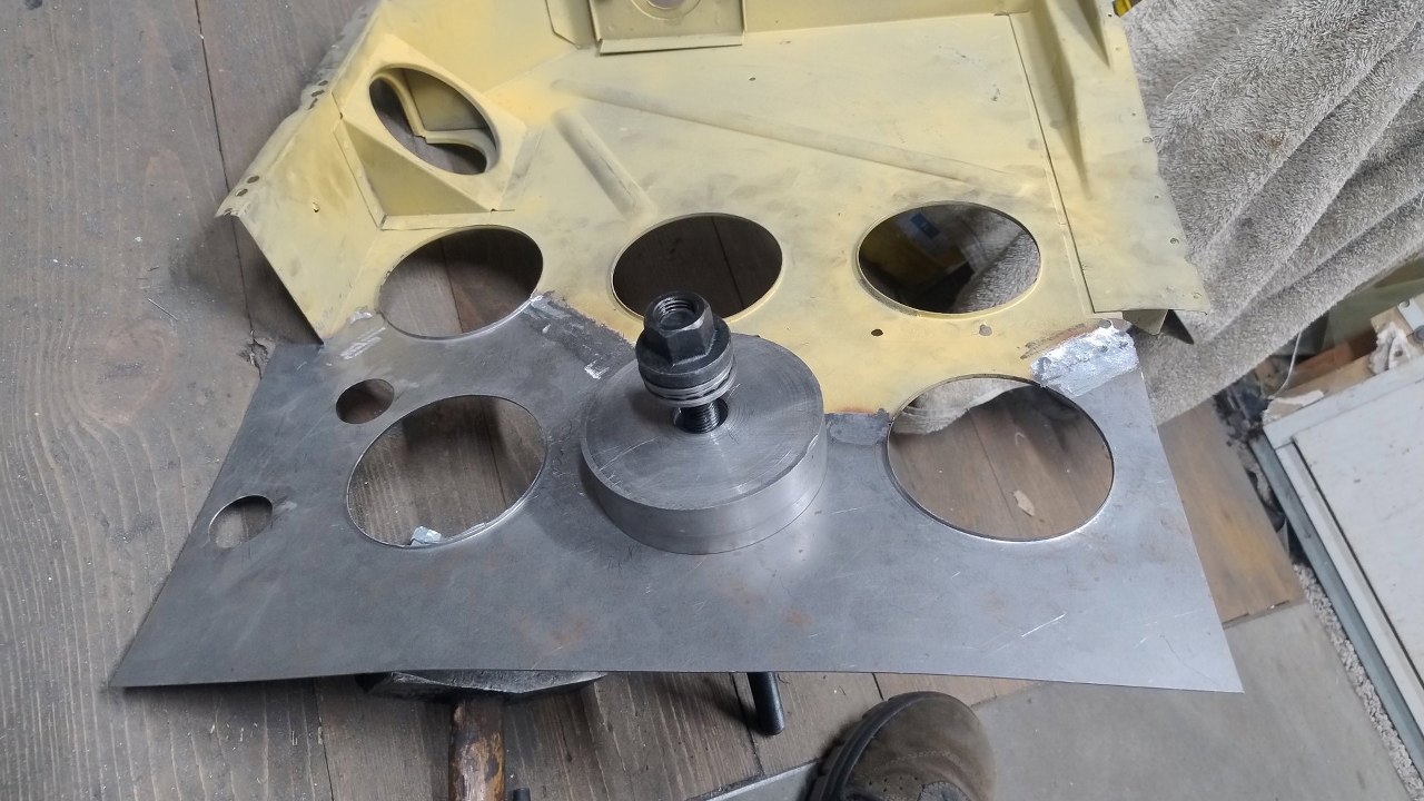 Wykrojnik (ten okrągły klocek stalowy) posłużył tu jako szablon do spasowania otworu.