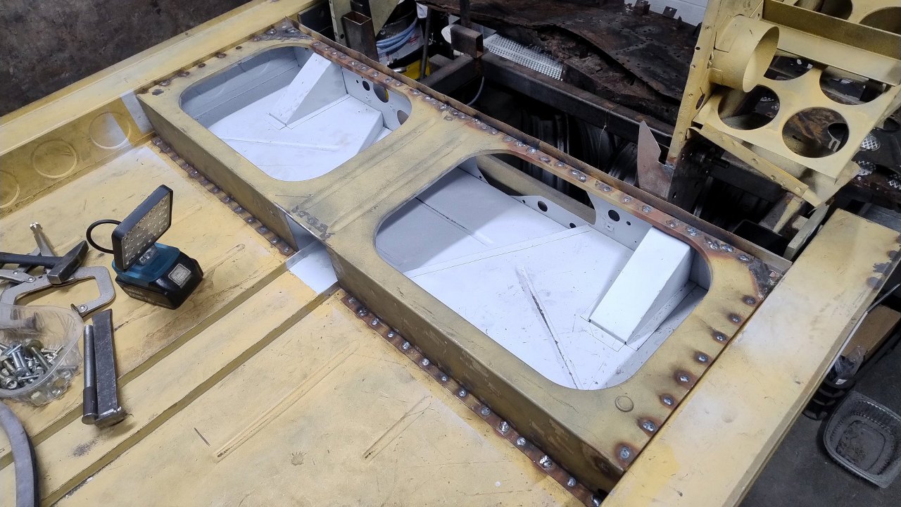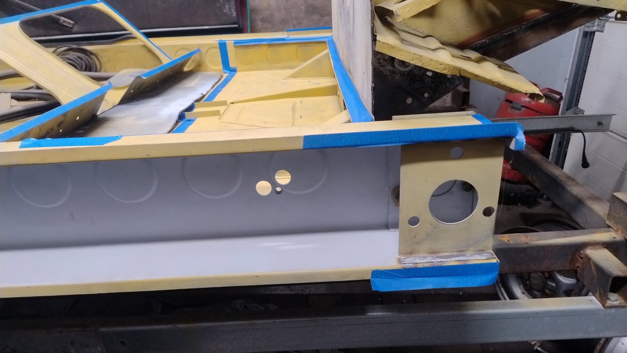 Maciej też dokończył naprawianie podstawy siedziska tylnej kanapy, wyznaczył jego dokładne położenie na podłodze i zabezpieczył i te części do pomalowania podkładem.