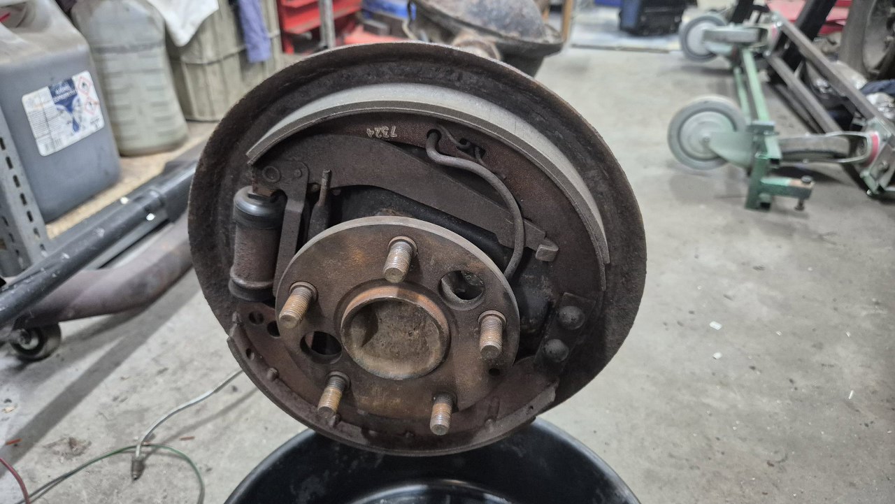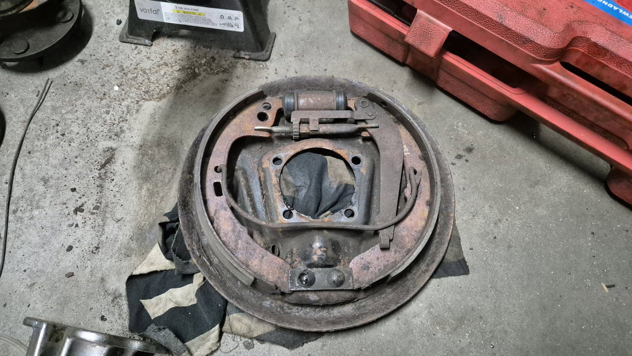 Po odpięciu spinek zdjąłem szczęki z tarczy kotwicznej. Szczęki mają jeszcze odrobinę mięska, ale i tak wymieniam na nowe - te mają pewnie ponad 50 lat, więc nie ma co ufać temu, że klej trzyma pewnie okładziny.
