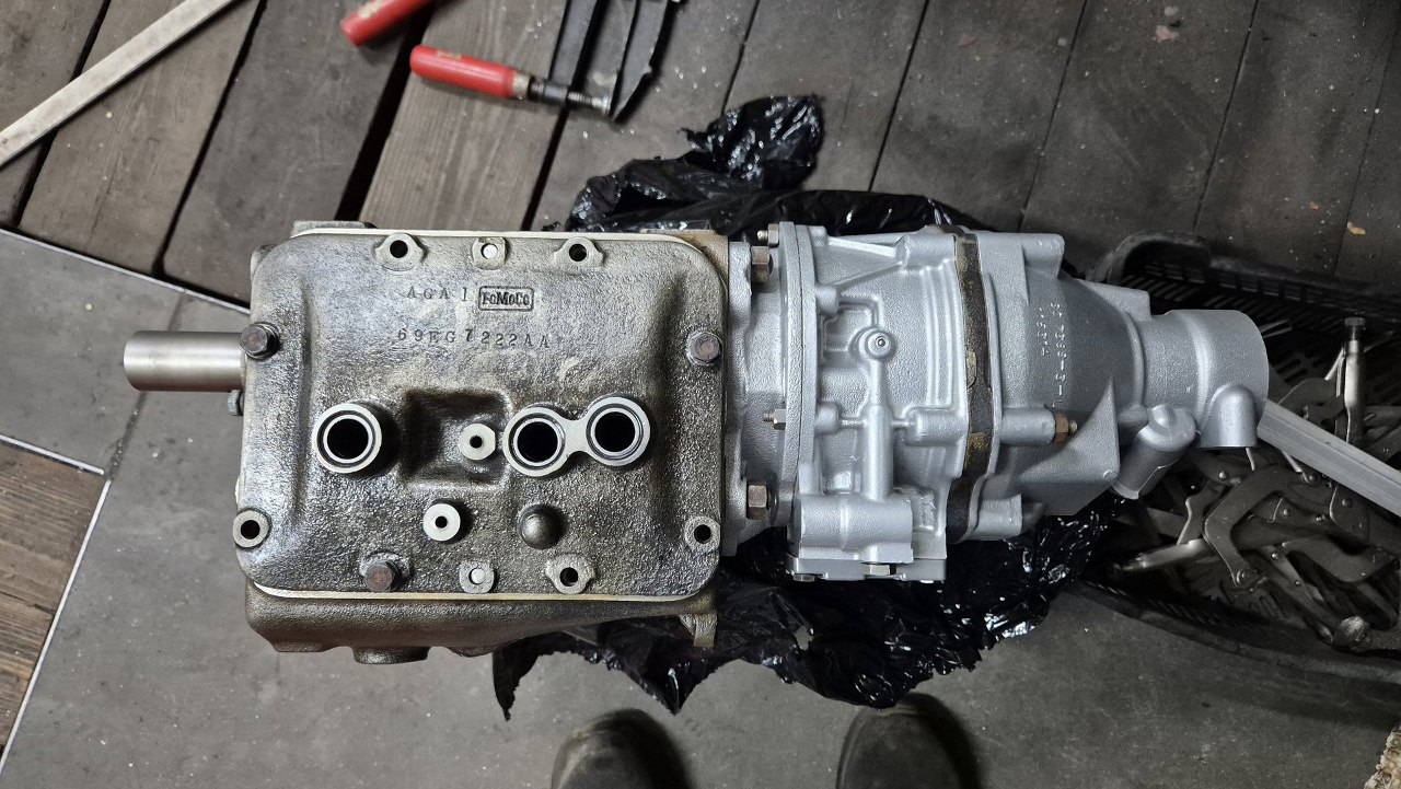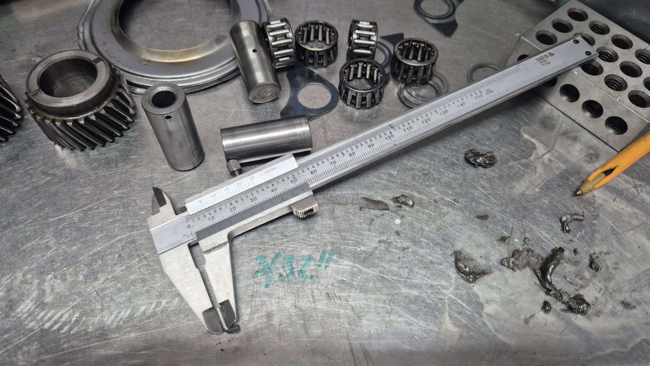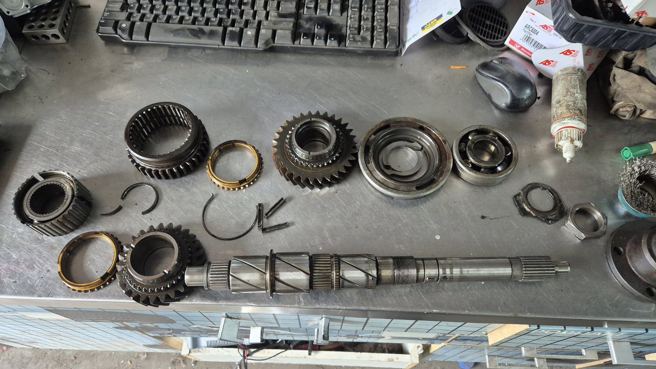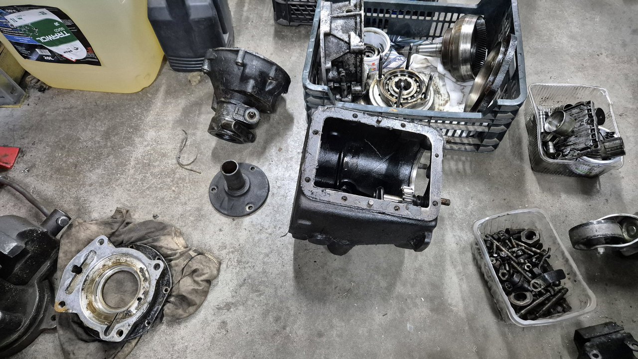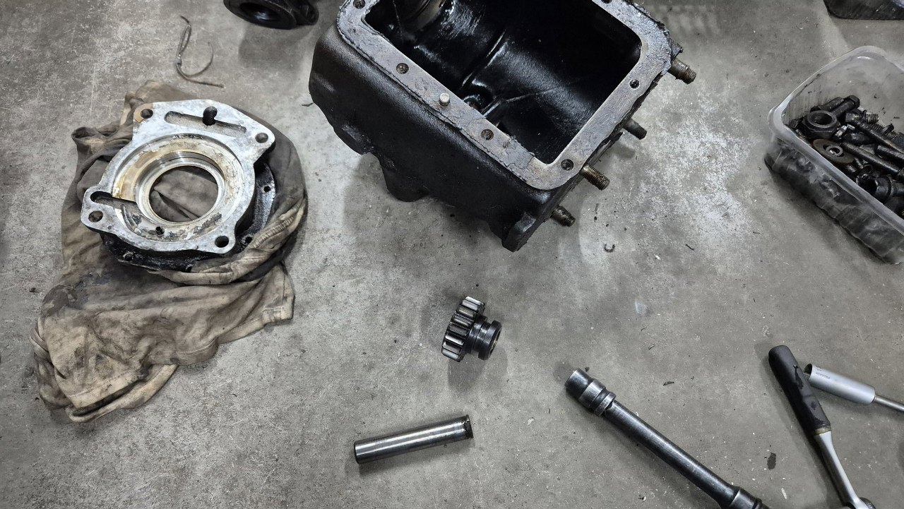 Pozwoliło mi to na zdemontowanie reszty przekładni. Tu zdjęte łożysko tylne i koła zębate pierwszego i wstecznego biegu.