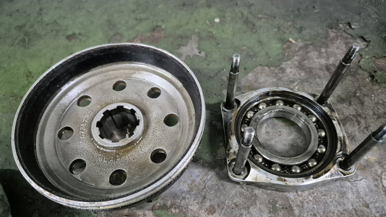 Przygotowując listę części do kupienia musiałem jeszcze w kilka miejsc zajrzeć tu akurat jest zestaw bębna przekładni planetarnej z łożyskiem i mocowaniem. Bęben na pewno jest do wymiany, bo ma mocno popękane okładziny cierne. Co ciekawe, część tą można odesłać i dostać za nią zwrot kaucji.