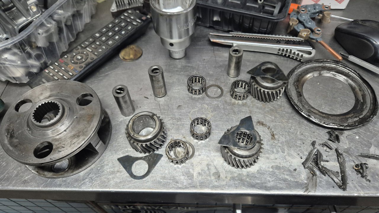 Najtrudniej było z satelitkami przekładni planetarnej. Łożyska mocno chrupały podczas kręcenia kółkami zębatymi, więc nie było opcji, żeby tego nie rozłożyć. Dostęp do osi zabezpieczała ta blacha leżąca obok. Jedyny sposób jej zdjęcia to delikatne jej odgięcie wzdłuż całego obwodu mocowania satelit. Pod nią widać trzy ośki, każda z nich zabezpieczona pinem wbitym w obudowe i ośkę. Na zdjęciu widać też pierścień z brudu i osadu spomiędzy tej blachy i mocowania satelit.