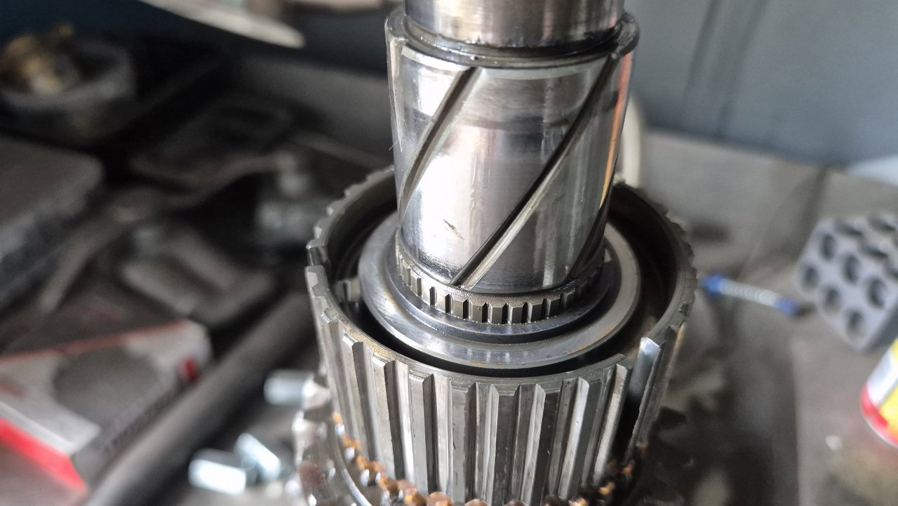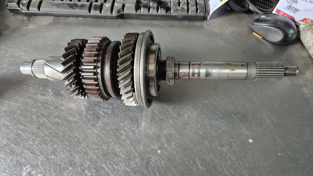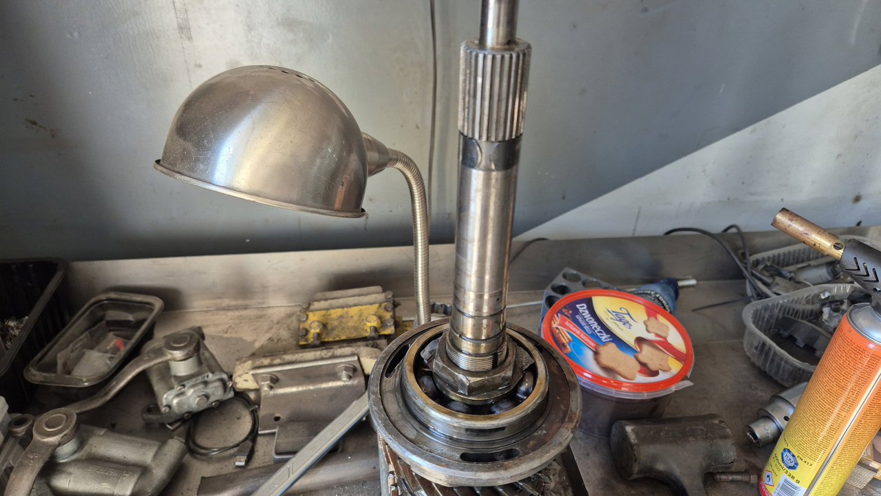 Został mi jeszcze do rozłożenia wałek wyjściowy skrzyni, z którego muszę odkręcić nakrętkę trzymającą łożysko. Nakrętka jest inna, niż w zwykłej skrzyni tego typu, więc nie mogę jej po prostu odciąć, a odkręcić się nie chce...