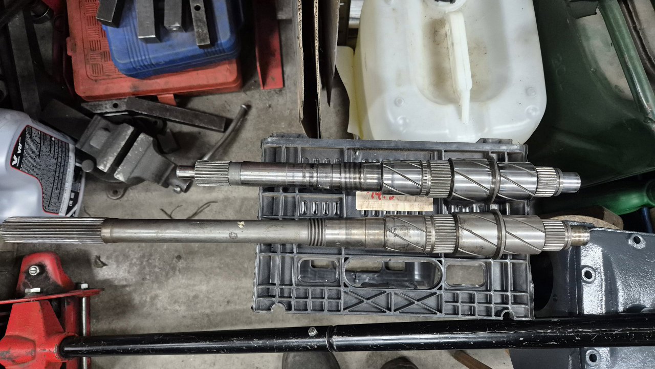 Przy okazji porównam wałki skrzyni - zwykłej, czterobiegowej u dołu, z tą z nadbiegiem u góry.