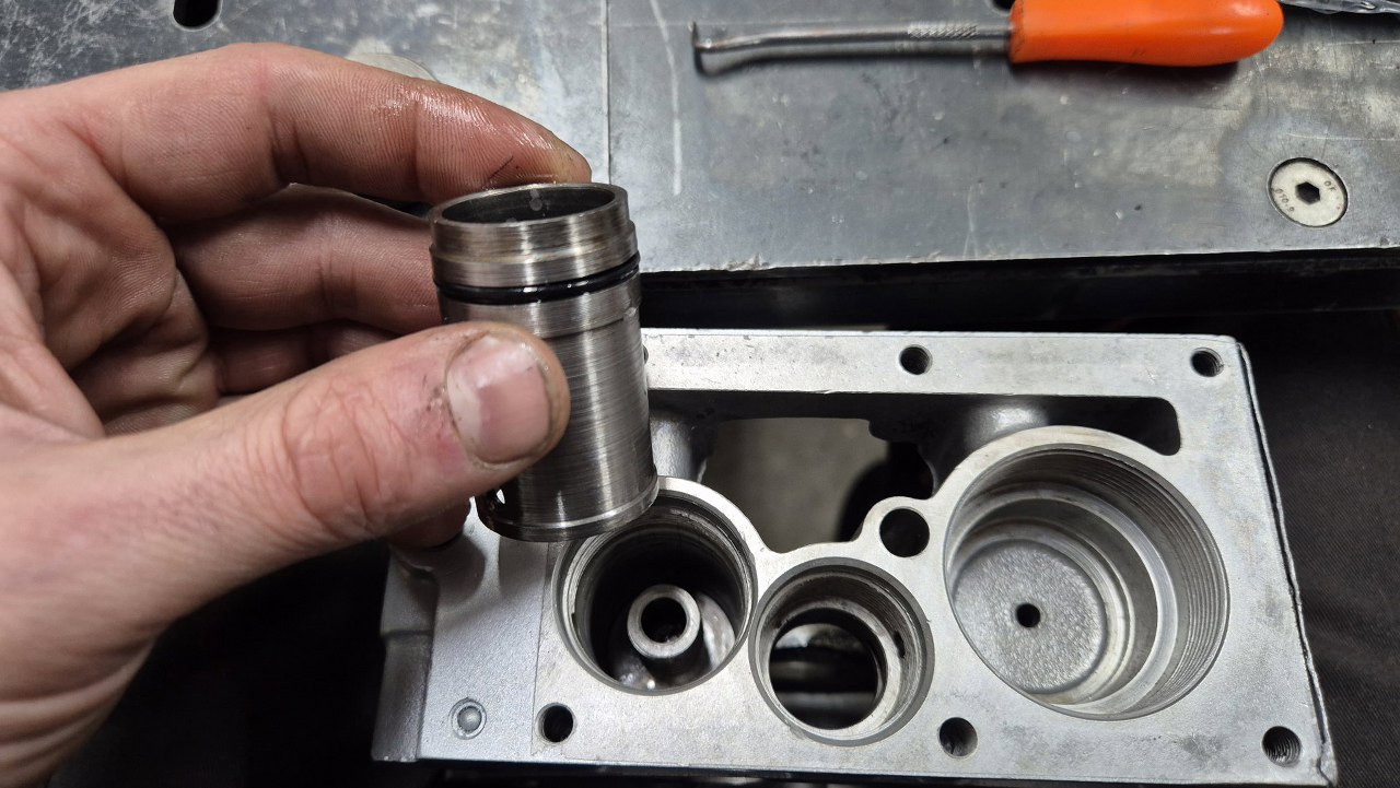 Najpierw mały tłoczek. Trzeba go dobrze włożyć, bo ciężko na miejsce wchodzi z nowymi uszczelkami.