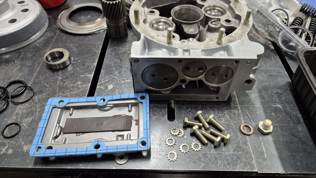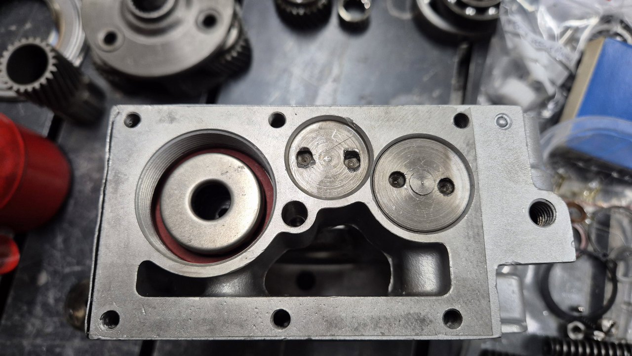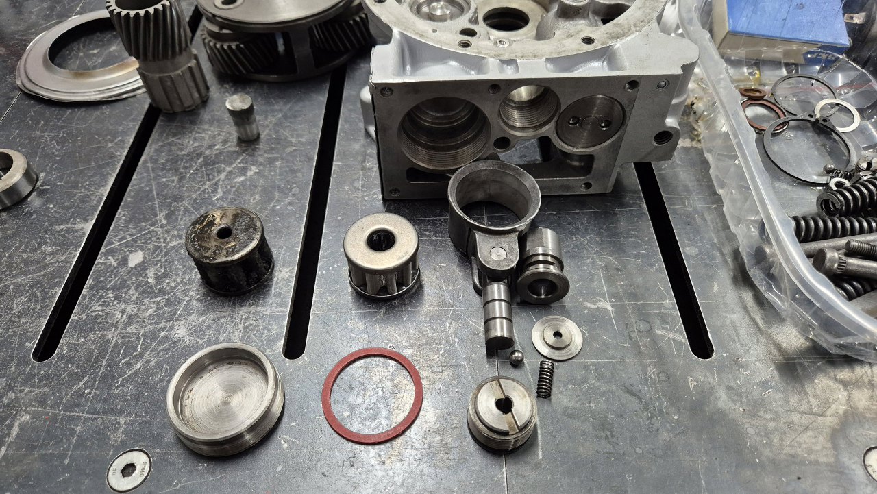 Po włożeniu tłoczków zajmę się zaworkami i resztą rzeczy wkręcanych od dołu obudowy. Tu główny zawór sterowany elektrozaworem wkręcanym z zewnątrz. Ułożyłem części w kolejności montażu.