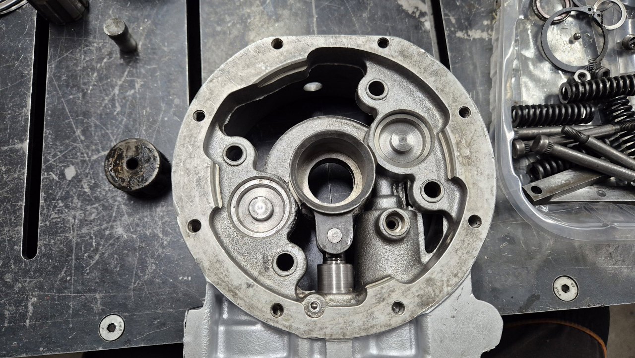 W korpus pompy wkładam z tej strony tłoczek zamocowany do części ślizgającej się po krzywce na wałku wyjściowym skrzyni. Krzywka będzie założona później.