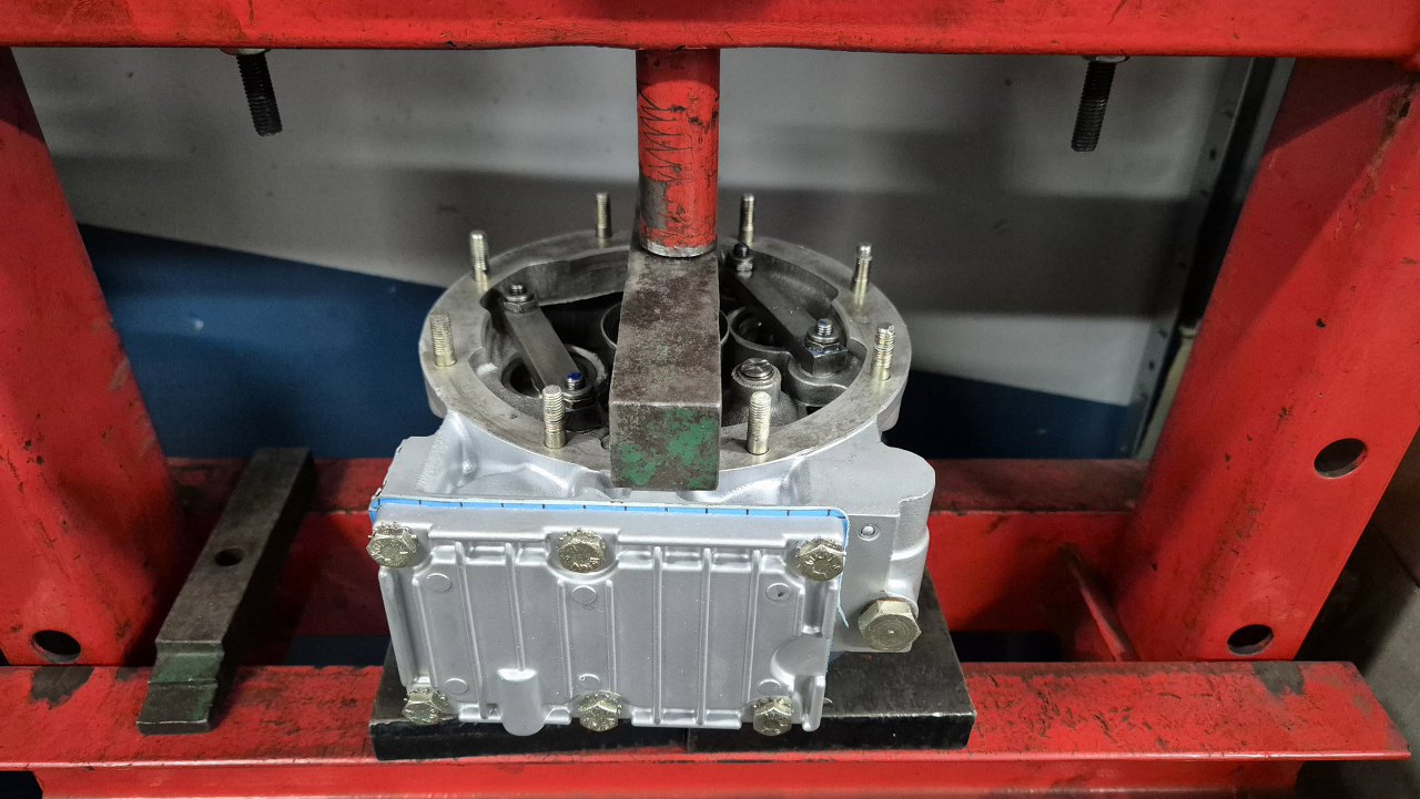 Jedno łożysko wciska się na prasie na wałek wyjściowy, drugie jest na razie w obudowie, ale wkłada się je później, lekko wbijając je na miejsce.
