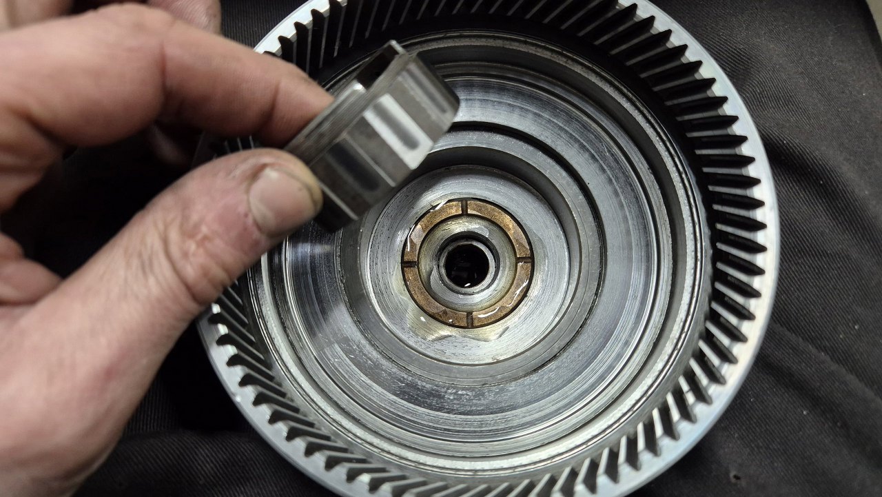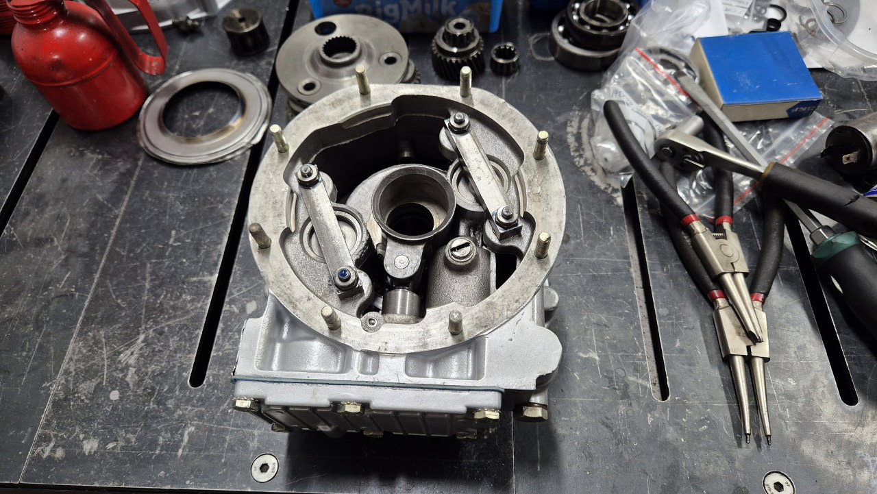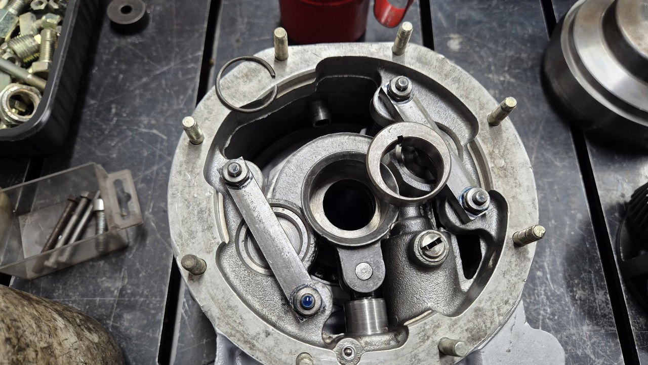 Na dół kładę posmarowaną olejem podkładkę oporową. W głębi widać tulejkę łożyskującą wałek wychodzący ze skrzyni.