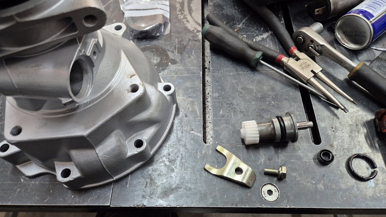 Od razu też złożę resztę napędu prędkościomierza. Sprawdziliśmy wcześniej z Piotrem, czy ślimak ma tą samą ilość zębów, co w jego obecnej skrzyni, a następnie policzył, ile zębów ma zębatka. Dzięki temu zamówiliśmy właściwą dla jego auta nową zębatkę.