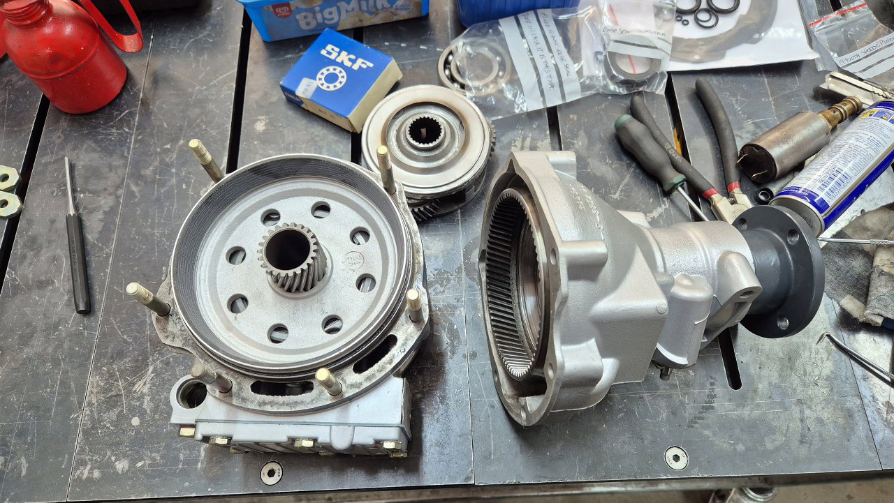 Dotarły do mnie zamówione części do overdrive, więc mogę i to złożyć. Porównałem odnowiony bęben ze starym, wygląda na taki sam, tylko ma naprawdę ładne, nowe okładziny cierne. Stary mogę więc z czystym sumieniem odesłać.