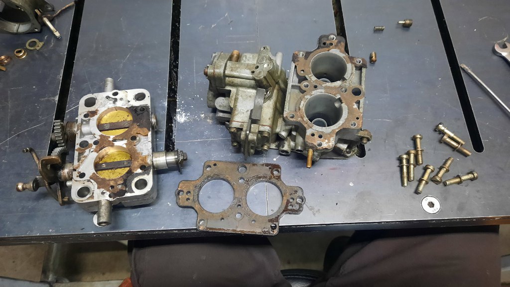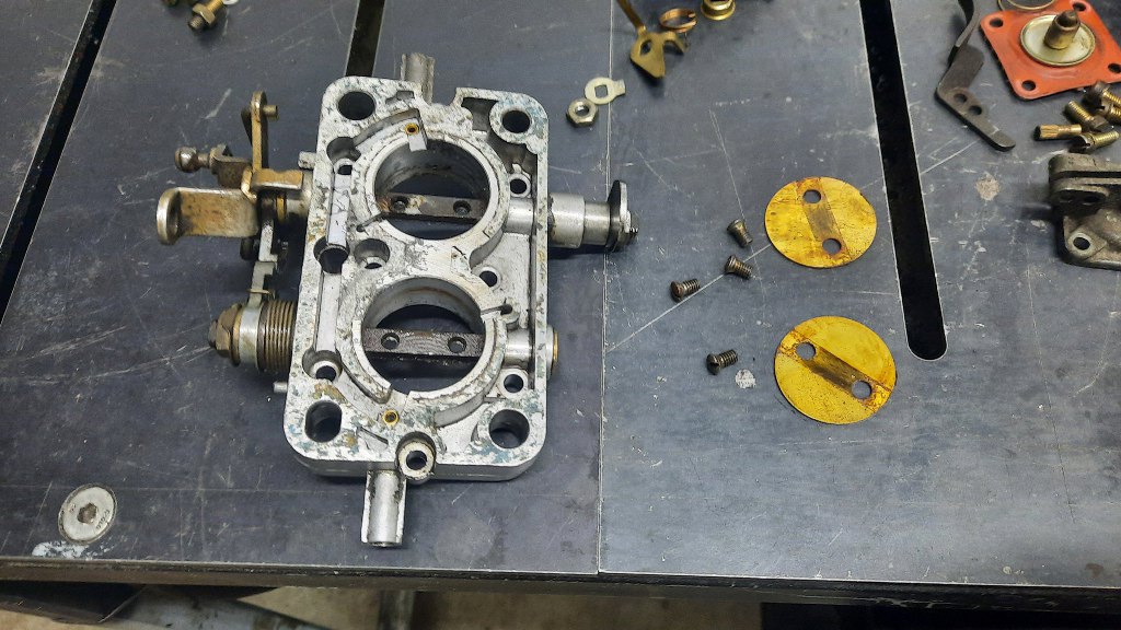 Poluzowałem śruby przepustnic (te na ośkach) i odkręciłem całą płytkę przepustnic od korpusu gaźnika.