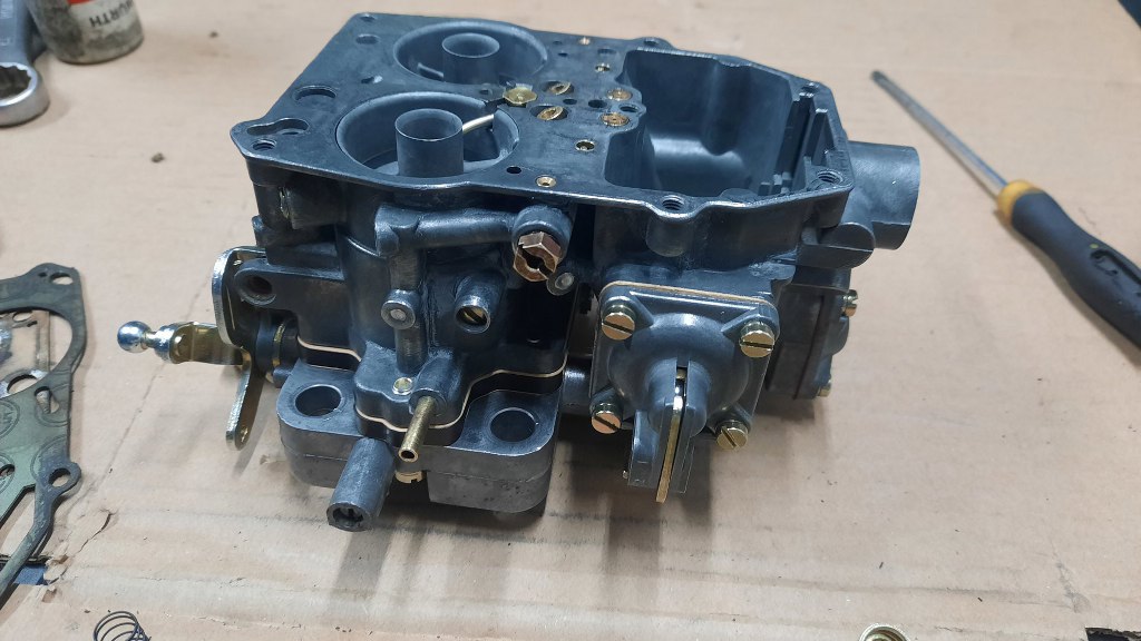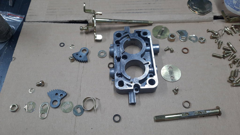 Potem zacząłem składać gaźnik od płytki z pzrepustnicami. Zawsze najtrudniej jest się zorientować z kolejności tyczh wszystkich części.