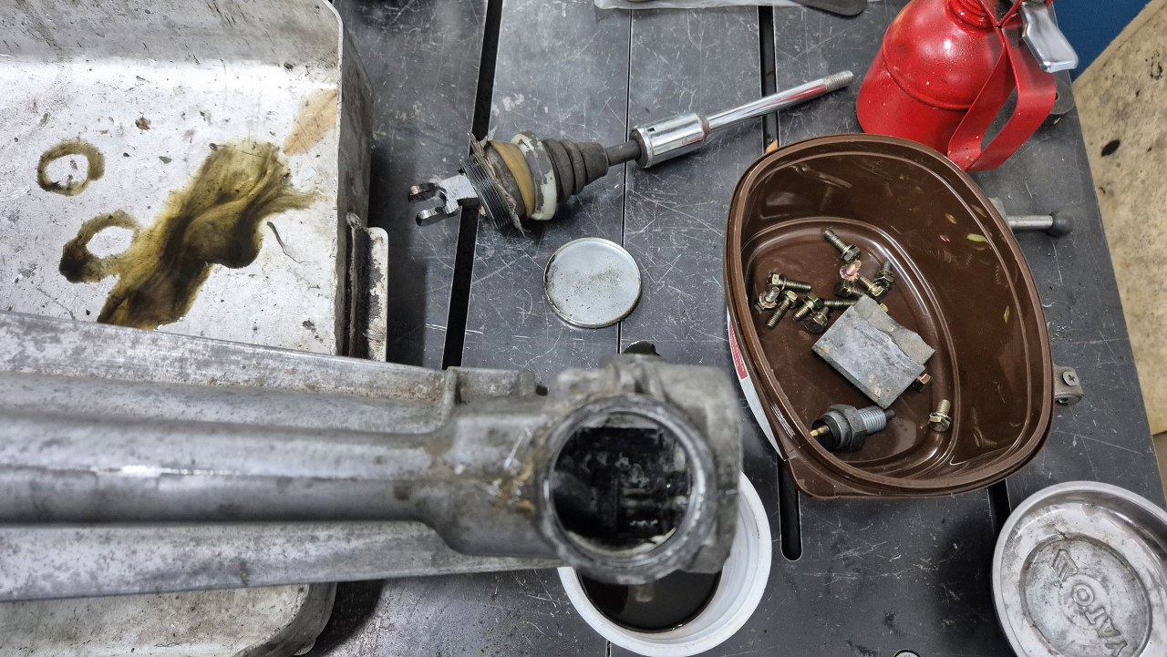 Zazwyczaj oczywiście uszczelnienie skrzyni wymaga jej rozłożenia, żeby się dostać do wszystkich uszczelek i uszczelniaczy. Poza tym, skrzynię z 1973 roku i tak warto porządnie umyć w środku.