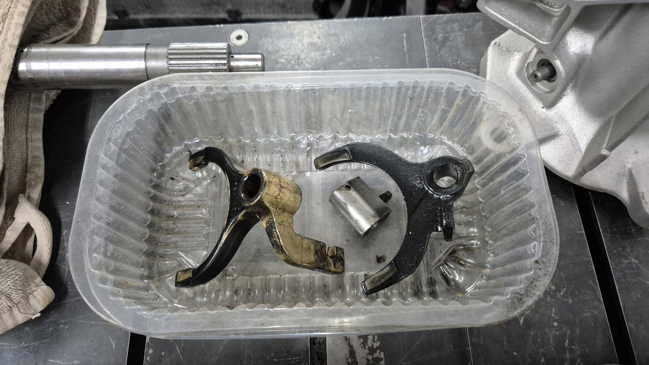 Widać w głębi, że przedni ryjek skrzyni jest odkręcony, a łożysko wysunięte. Ja odkręcam korek trzymający sprężynę i kołek blokujący biegi w odpowiednich pozycjach.