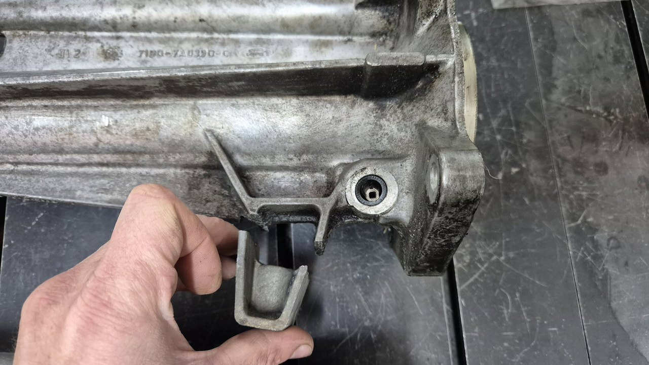 Rozkładanie zaczynam od wykręcenia dźwigni zmiany biegów, czujnika wstecznego i wybiciu zaślepki z końca ogona skrzyni.