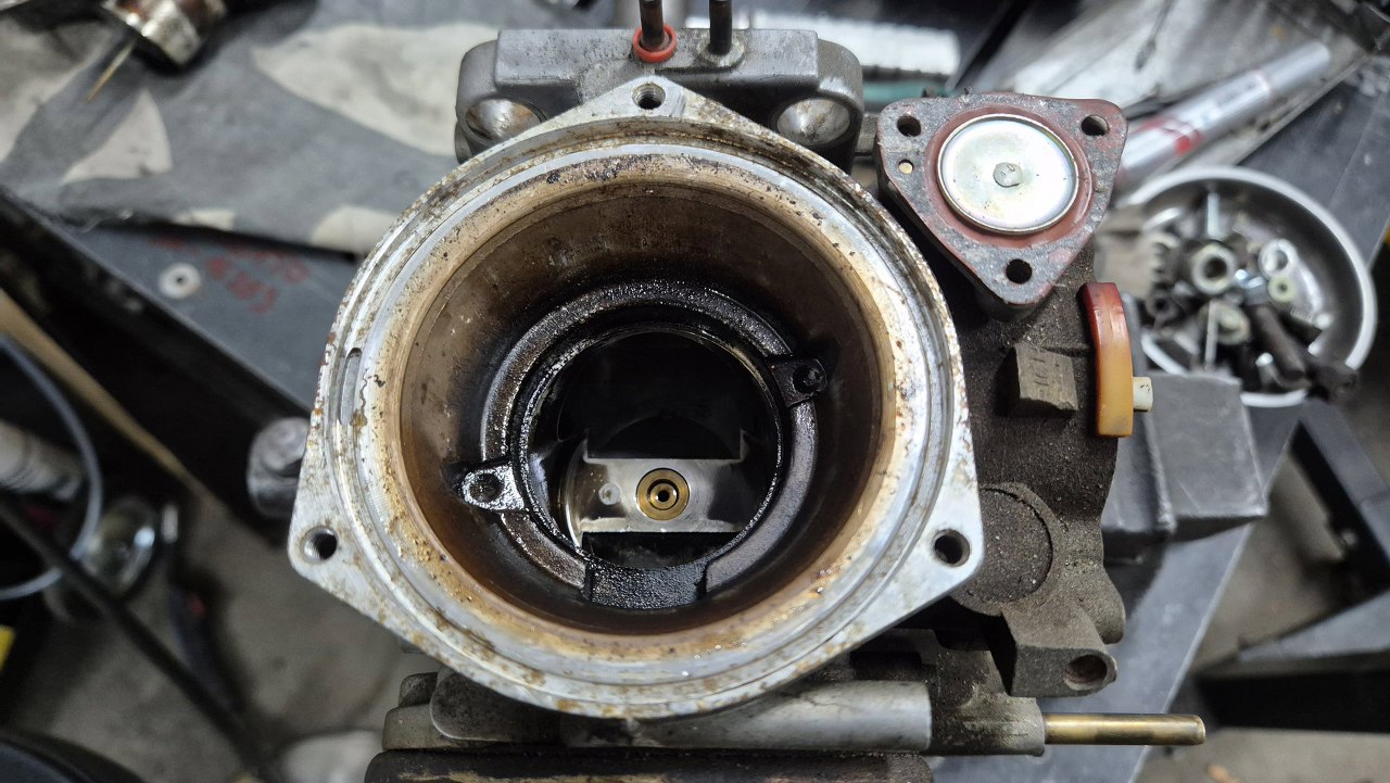 A tu widok z góry do środka gaźnika. Na dnie widać dyszę paliwową.
