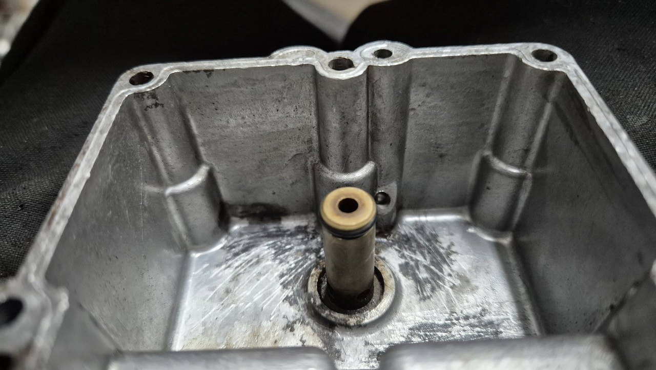 Po zdjęciu pokrywki widać trochę ATF. Powinien ybć wlany do środkowego otworu, ale zawsze jego część się tu wylewa. Nie powinno tu tego być, ale też nie szkodzi to niczemu, więc nie jest to problem.