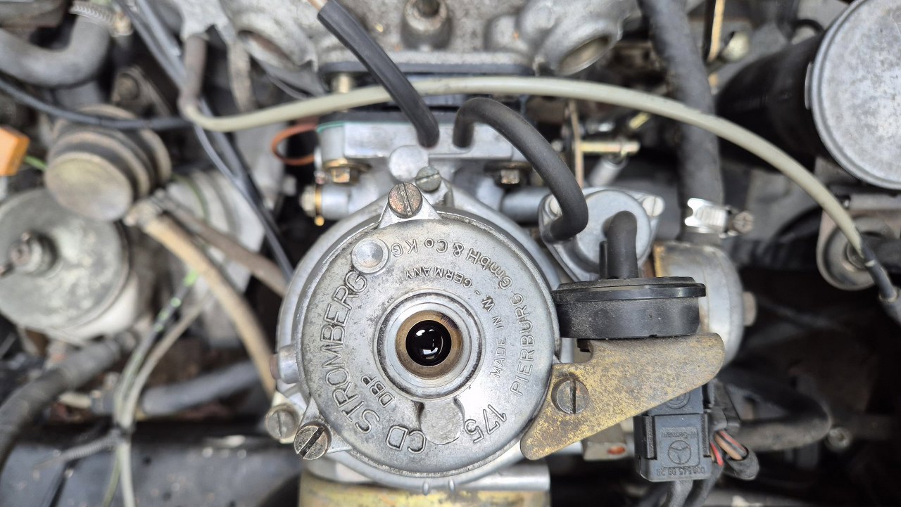 Najpierw zdjąłem rurę dolotową i zacząłem odpinać rurki i kabelki. Sam gaźnik to Stromberg 175CD. Widać, że jest zapyziały. Zwłaszcza komora pływakowa, tu niewidoczna, ale będąca na samym dole gaźnika, jest mocno upaprana.