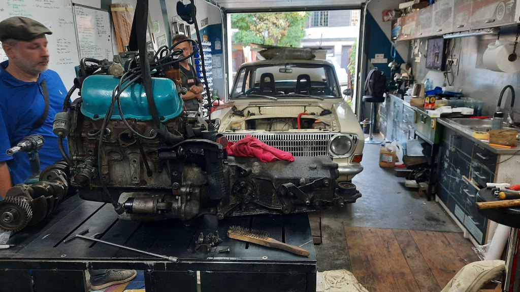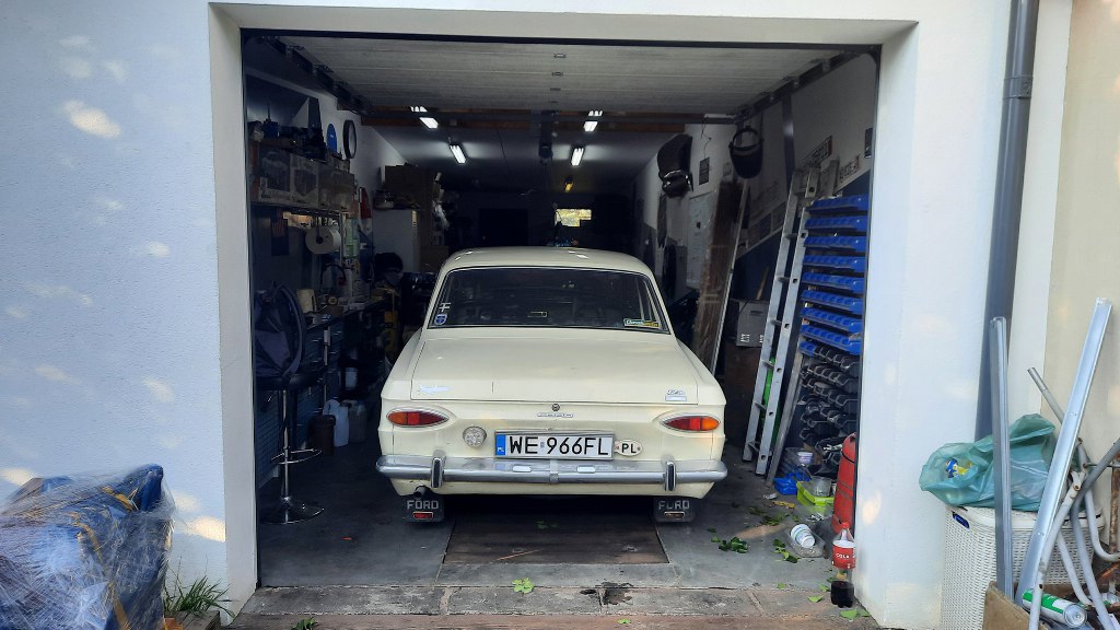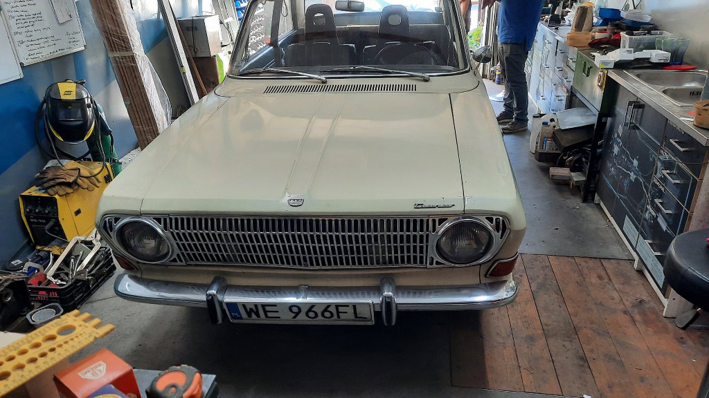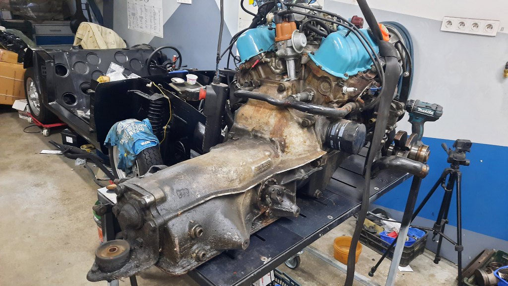 Ja mam zająć się układem napędowym. Skrzynia cała cieknie, silnik trochę niedomaga - jest po prostu zużyty. Zobaczę, co się da z tym zrobić. Póki co samochód przyjechał na lawecie, żebym mógł wyciągnąć silnik i skrzynię i się nimi zająć. A Taunus wróci do garażu i tam sobie poczeka.
