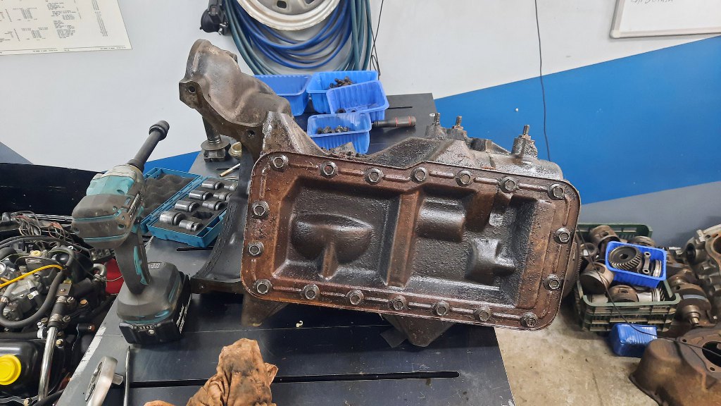 Teraz przewróciłem skrzynię na bok, żeby dostać się do śrub dolnej pokrywy. Nie nazywam tego miską olejową, bo jest wklęsła.