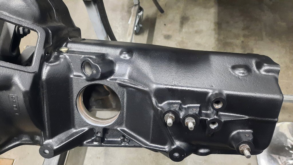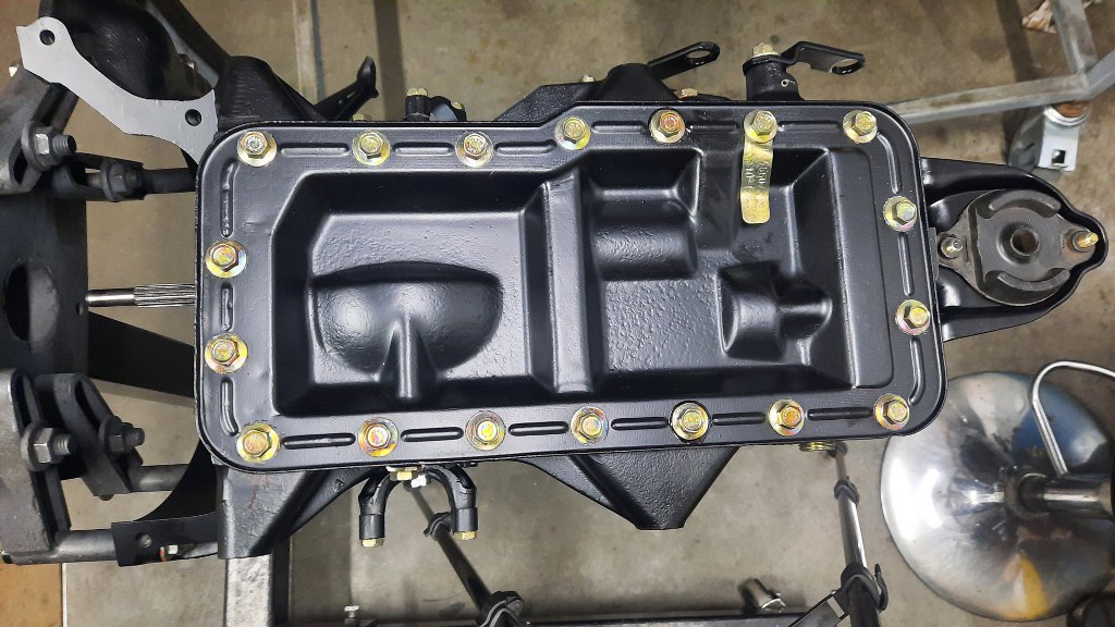 I na deser pokrywę dolną. Czy miskę oleju. Ale miska jest zazwyczaj wklęsła, a ta jest wypukła. To przykręciłem blachę zamykającą skrzynię od dołu, ok? :) Blaszka znamionowa po odnowieniu trafiła na swoje miejsce.
