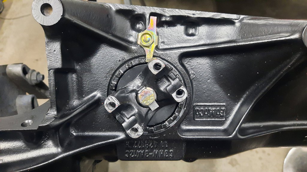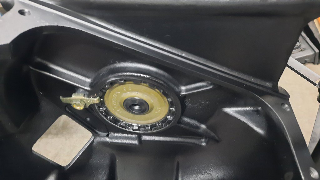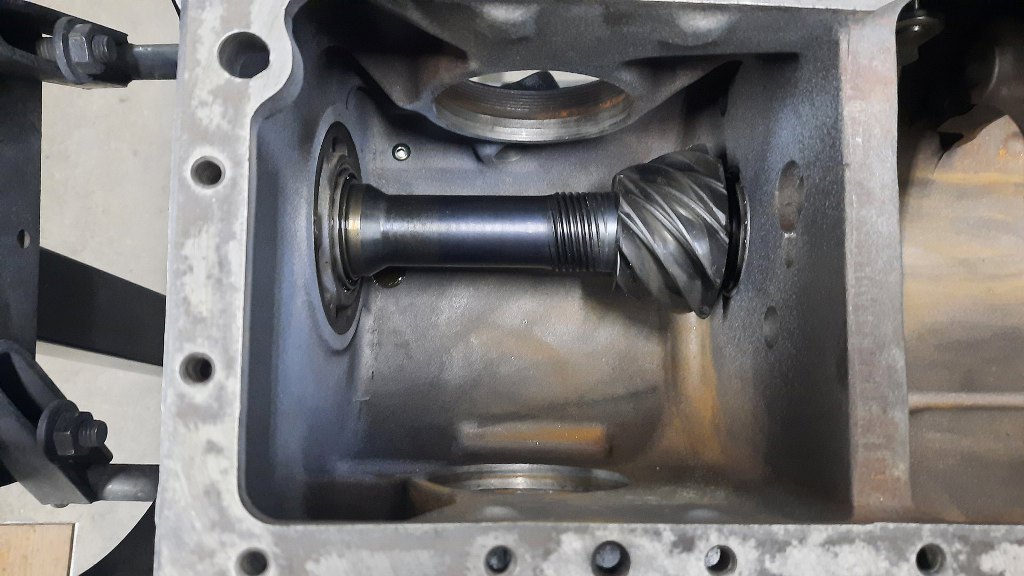 Przykręciłem go pokrywką przednią, która w sobie trzyma bieżnię łożyska wałka. Przykręceniem tej pokrywki reguluje się naprężenie wstępne łożysk wałka ataku. Potem przykręciłem zabezpieczenie tej pokrywki przed odkręceniem.