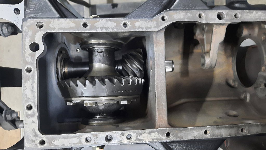 Mechanizm różnicowy trzymany w obudowie jest pokrywkami bocznymi, które (podobnie jak pokrywka przednia) też mają bieżnię łożyska w sobie. No i simmering. Przykręceniem pokrywek z obu stron reguluje się położenie koła talerzowego w stosunku do wałka atakującego, jak również luz międzyzębny. Ale i tak łatwiej jest to ustawić kręcąc tymi pokrywkami niż, w normalnym moście, wymieniając podkładki dystansowe pod łożyskami. Oczywiście po regulacji tu też przykręciłem śrubę z podkładką zabezpieczającą.