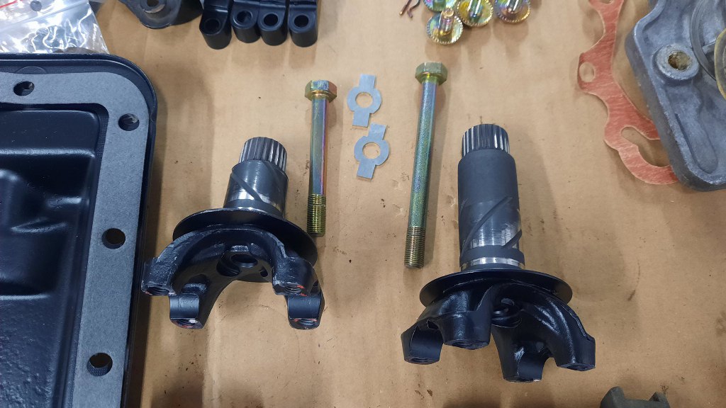 Przykręciłem też stopki półosi, które trzymają przeguby półosi do skrzyni.
