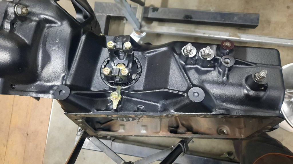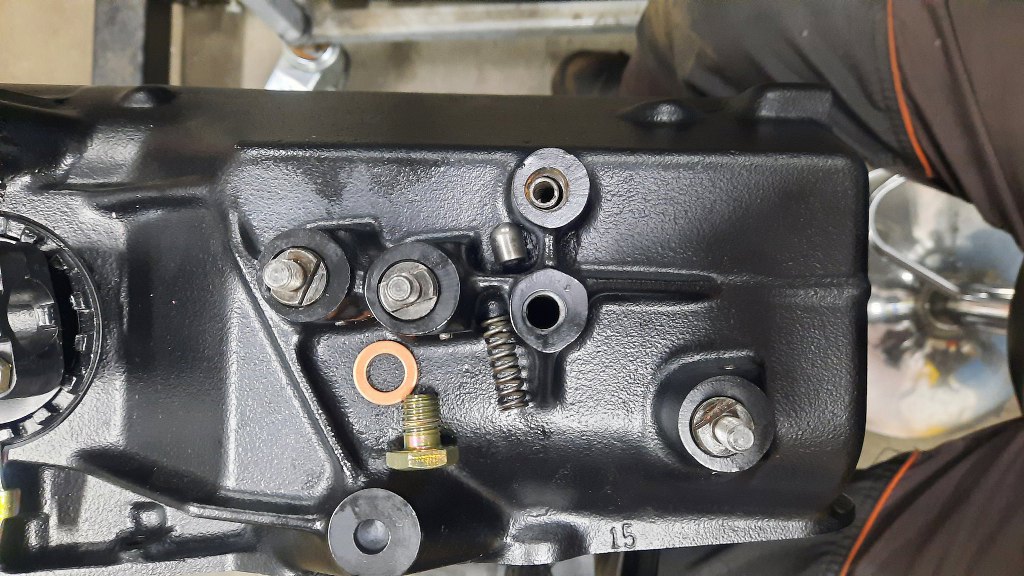 Ostatni bolec wchodzi od dołu skrzyni w ten sam otwór, co bolce blokujące wrzucenie dwóch biegów na raz. po bolcu i sprężynie całość jest zamknięta śrubą z łbem na płaski śrubokręt. A na to przyjdzie jeszcze uszczelka i miska olejowa.