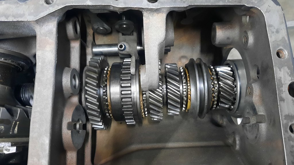 I włożyłem do środka. Po lewej trafia to wieloklinem na wałek ataku. W tym momencie trzeba też włożyć widełki wybieraka biegów 1 i 2 na miejsce.