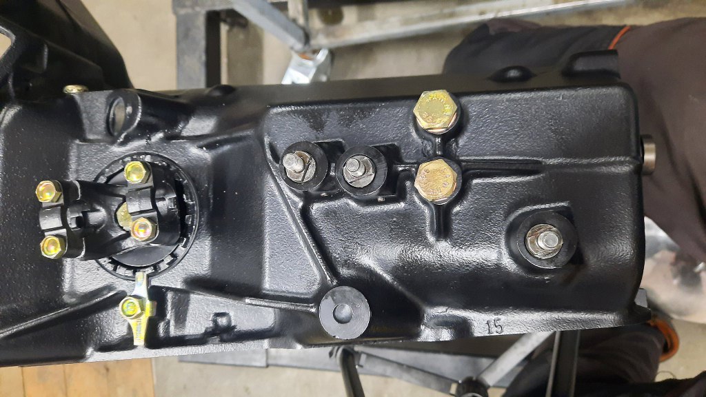 Potem przykręciłem śruby pokrywy. Każda z nich wchodzi na wylot do skrzyni, więc niezbędne jest użycie uszczelniacza do gwintów. Cztery śruby trzymają też łapę skrzyni. Przykręciłem też nową poduszkę skrzyni. Potem jeszcze wsunąłem wałek sprzęgłowy i zabezpieczyłem go klipsem, a następnie przykręciłem korek w środek tej pokrywy, ale ie zrobiłem zdjęcia... :(
