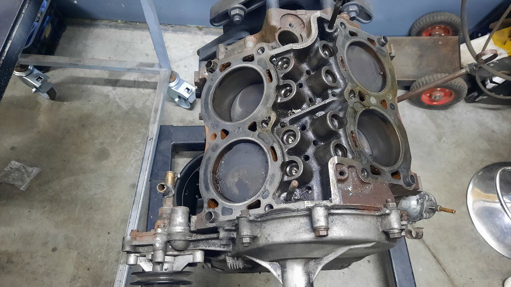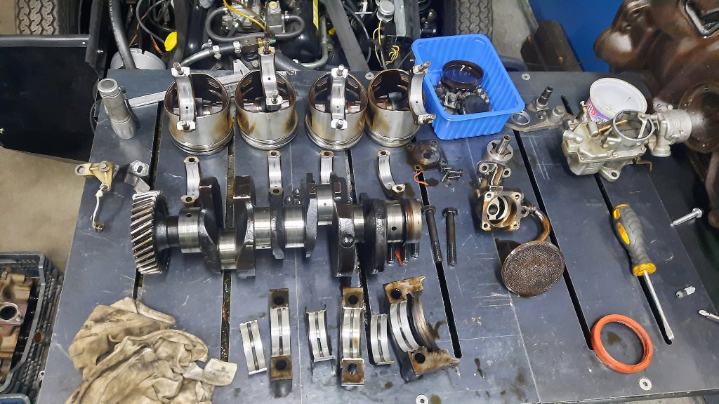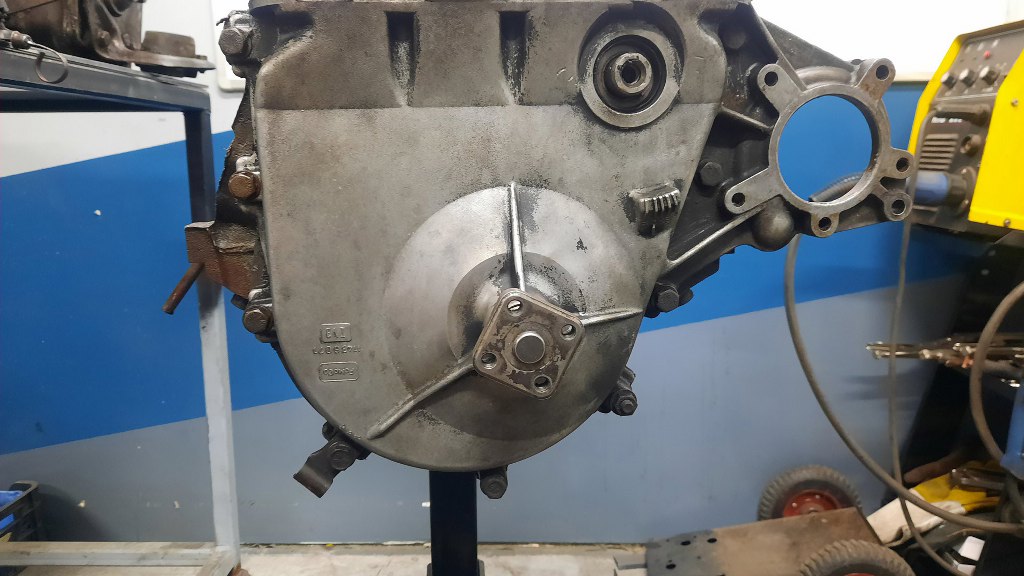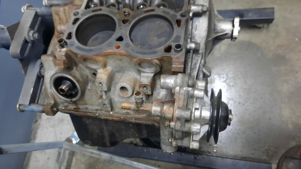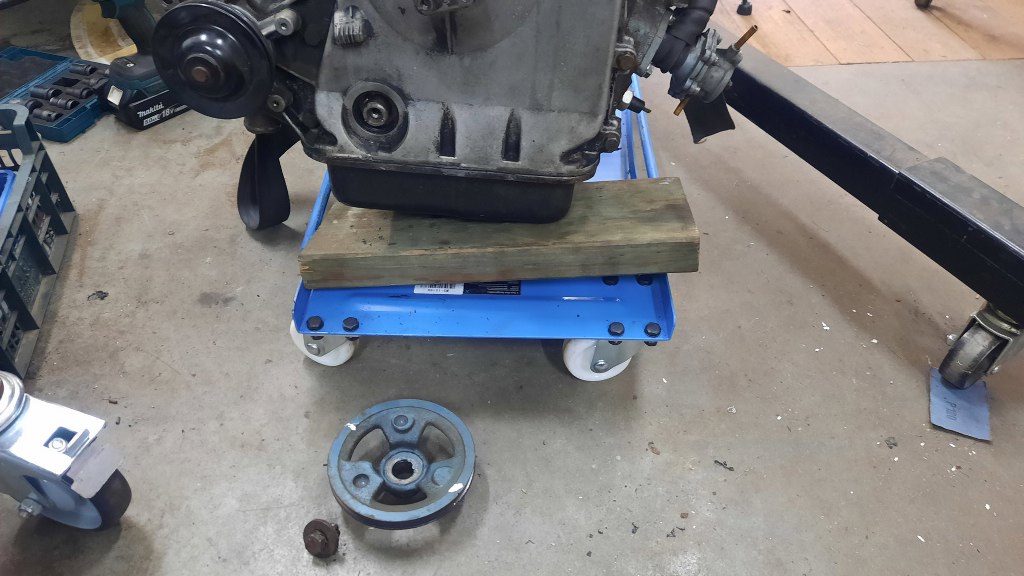 Po złożeniu skrzyni mam trochę wolnego miejsca na półce, bo wszystkie części skrzyni schowałem do jej środka :). Rozłożę zatem silnik. Zobaczymy co jest w środku i w jakim stanie. Sporo wcześniej, jeszcze przy okazji oddzielenia silnika od skrzyni, zdjąłem koło pasowe i oddałem je do piaskowania z innymi rzeczami.