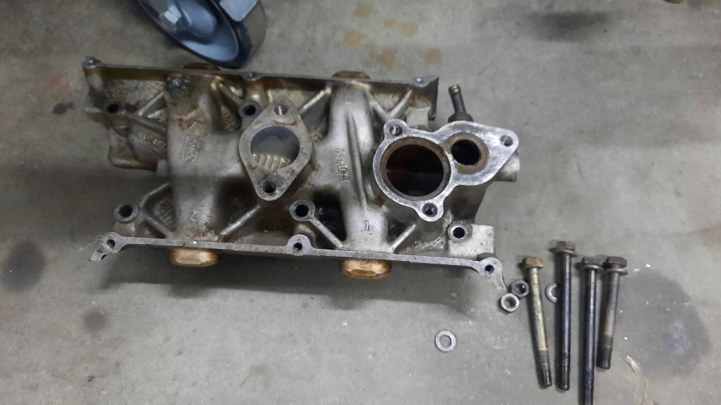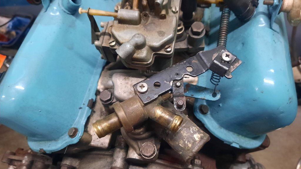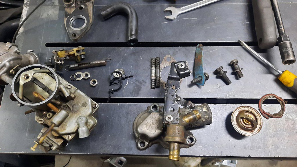 Zdjąłem gaźnik i obudowę termostatu. Obudowa od spodu jest dość mocno wygnita i trzeba będzie ją wymienić.