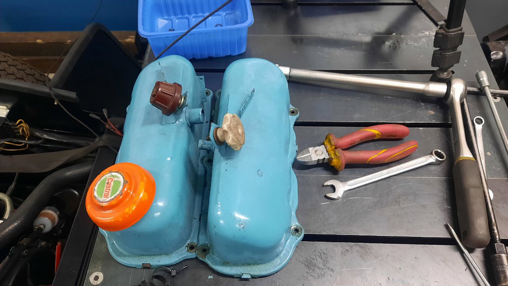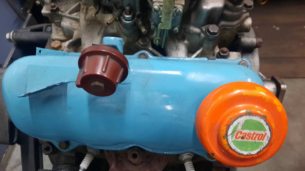 Całkiem fajną spuścizną niefajnych czasów, w których ten samochód jeździł po Polsce, są te kurki od kranów zastosowane jako nakrętki śrub mocujących filtr powietrza. Uroczy jest też korek wlewu oleju. Pokrywy są malowane pędzlem, w prawie oryginalny kolor. To będziemy chcieli zachować po remoncie bez zmian, bo jest to świadectwo przeszłości tego samochodu.