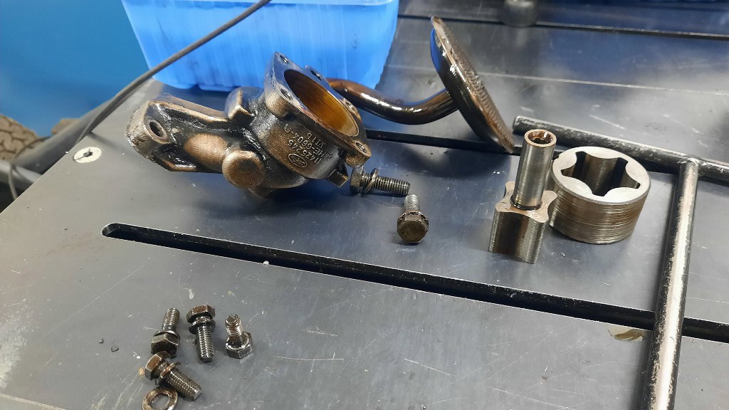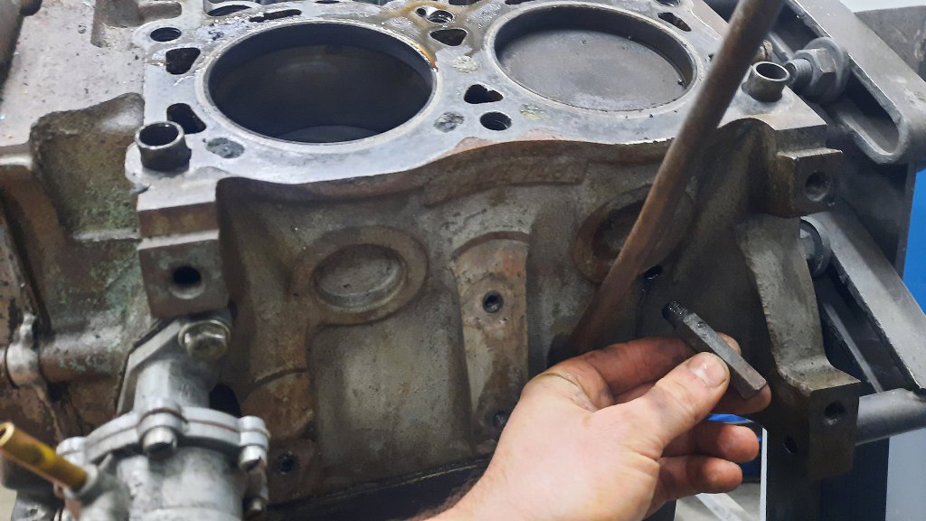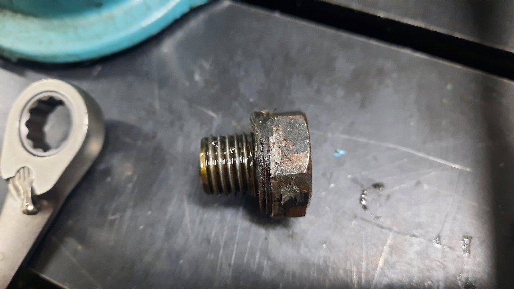 I korek oleju, żeby już olej spływał z miski olejowej. Korek jest nietypowy, bo ma łepek na klucz 17, a nie 13. potem zwróciłem jeszcze uwagę, że gwint nie jest M14x1,25, a M16x1,5. Ktoś po prostu nie miał właściwego korka i wkręcił ten. I nie byłoby w tym nic złego, gdyby nie to, że wkręcił go krzywo... a to już słabo. Michał, właściciel silnika, ma jeszcze oryginalny silnik w zapasie (zatarty czy coś), prawdopodobnie z niego pozyskamy jakieś części - być może i miskę oleju z niepopsutym gwintem.